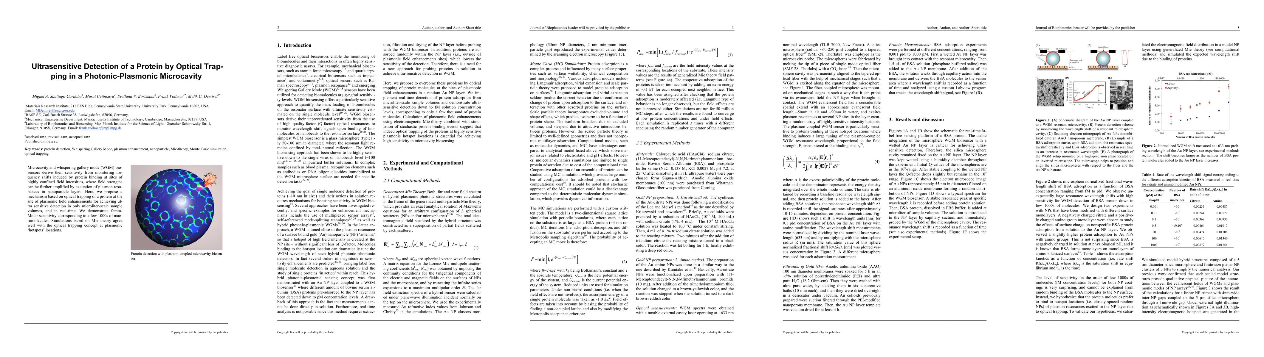 This paper proposes an ultrasensitive protein detection method using optical trapping within a photonic-plasmonic microcavity, leveraging plasmonic field enhancements and real-time monitoring. The technique achieves femto-molar sensitivity and demonstrates detection of a few thousand macromolecules in microliter-scale samples, validated by Mie theory simulations.