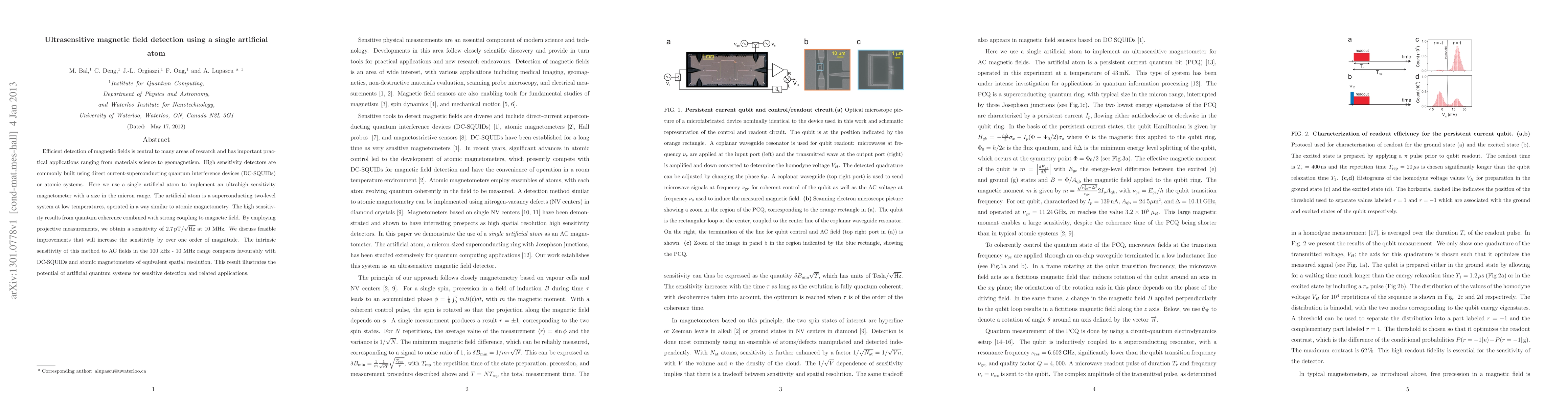 Efficient detection of magnetic fields is central to many areas of research and has important practical applications ranging from materials science to geomagnetism. High sensitivity detectors are commonly built using direct current-superconducting quantum interference devices (DC-SQUIDs) or atomic systems. Here we use a single artificial atom to implement an ultrahigh sensitivity magnetometer with a size in the micron range. The artificial atom is a superconducting two-level system at low temperatures, operated in a way similar to atomic magnetometry. The high sensitivity results from quantum coherence combined with strong coupling to magnetic field. By employing projective measurements, we obtain a sensitivity of $2.7\, \t{pT}/\sqrt{\t{Hz}}$ at 10 MHz. We discuss feasible improvements that will increase the sensitivity by over one order of magnitude. The intrinsic sensitivity of this method to AC fields in the 100 kHz - 10 MHz range compares favourably with DC-SQUIDs and atomic magnetometers of equivalent spatial resolution. This result illustrates the potential of artificial quantum systems for sensitive detection and related applications.