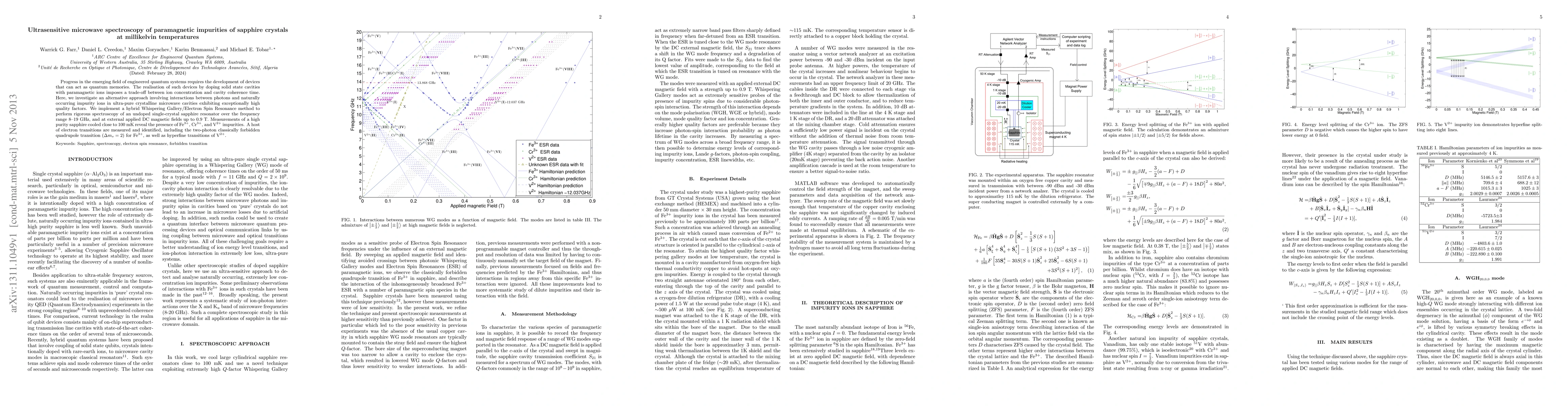 The paper presents a novel method for ultrasensitive microwave spectroscopy of naturally occurring impurity ions in ultra-pure sapphire crystals, cooled to near 100 mK. Utilizing a hybrid Whispering Gallery/Electron Spin Resonance technique, Fe³⁺, Cr³⁺, and V²⁺ impurities were identified and their electron transitions, including forbidden quadrupole transitions for Fe³⁺, were measured. This research paves the way for developing quantum memory devices using naturally doped crystalline microwave cavities.