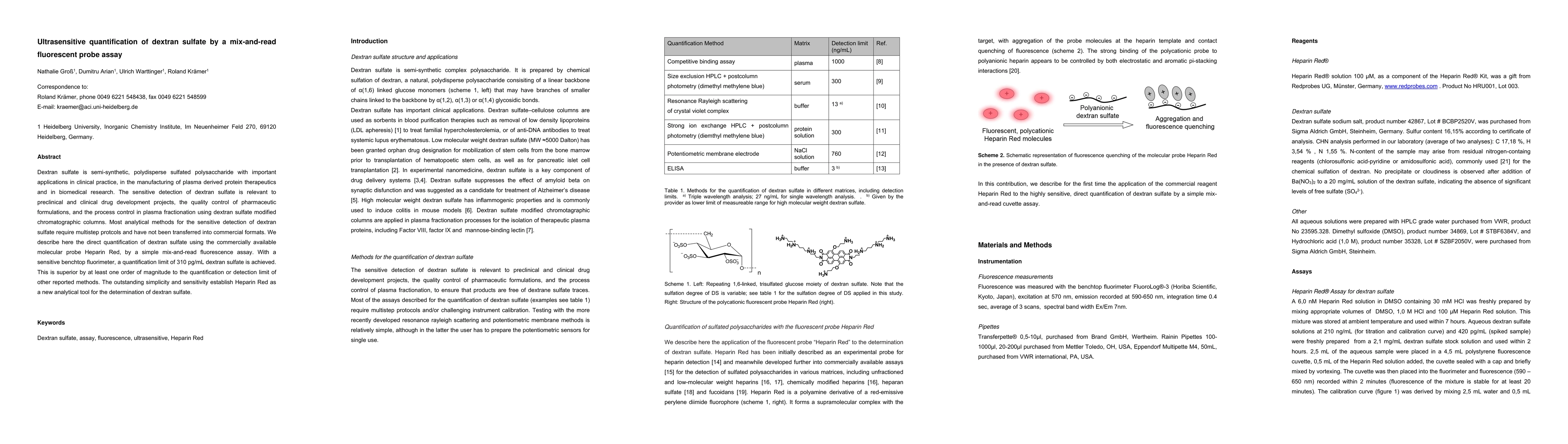 This paper introduces a simple mix-and-read fluorescent probe assay using Heparin Red for ultrasensitive quantification of dextran sulfate, offering a quantification limit of 310 picograms per mL, significantly better than existing methods. This new approach simplifies detection and enhances its applicability in clinical and research settings.