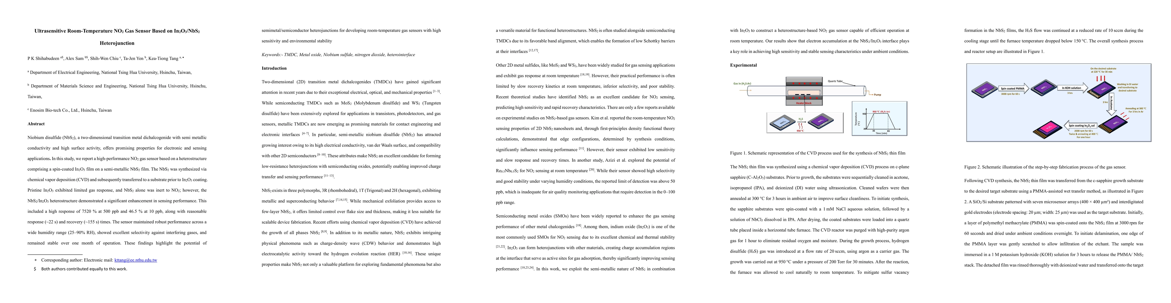 Niobium disulfide (NbS2), a two-dimensional transition metal dichalcogenide with semi metallic conductivity and high surface activity, offers promising properties for electronic and sensing applications. In this study, we report a high-performance NO2 gas sensor based on a heterostructure comprising a spin-coated In2O3 film on a semi-metallic NbS2 film.
