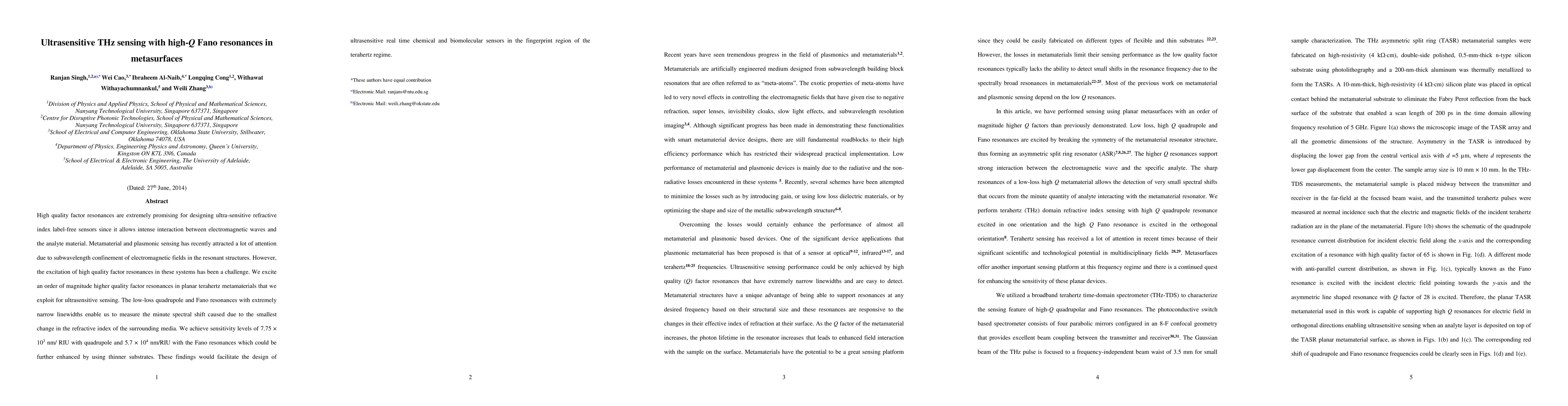 This paper explores ultrasensitive THz sensing using high-Q Fano resonances in metasurfaces, achieving sensitivity levels of 7.75 x 10^3 nm/ RIU with quadrupole and 5.7 x 10^4 nm/ RIU with Fano resonances, enabling precise detection of minute refractive index changes. These findings hold promise for advanced real-time chemical and biomolecular sensors.