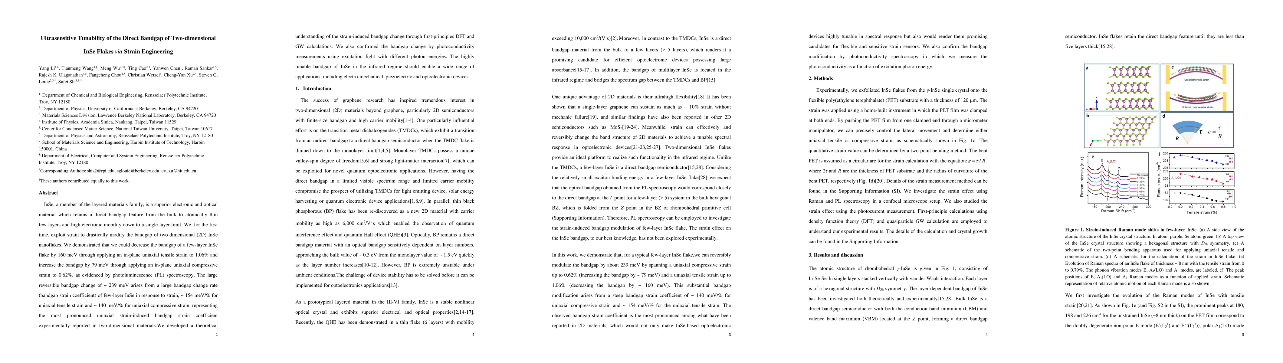 This research demonstrates the ultrasensitive tunability of the direct bandgap in two-dimensional InSe nanoflakes via strain engineering, achieving a reversible bandgap change of ~239 meV through in-plane uniaxial strains. Theoretical and experimental results show promising applications in electro-mechanical, piezoelectric, and optoelectronic devices.