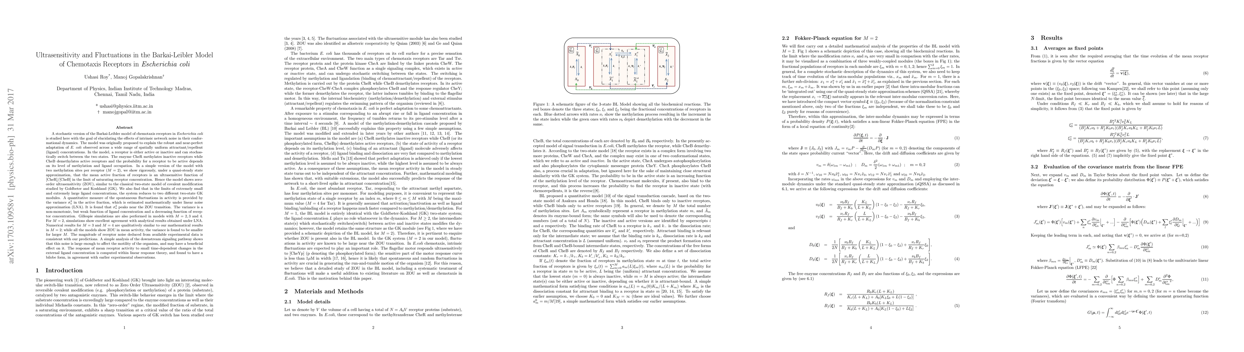 A stochastic version of the Barkai-Leibler model of chemotaxis receptors in {\it E. coli} is studied here to elucidate the effects of intrinsic network noise in their conformational dynamics. It was originally proposed to explain the robust and near-perfect adaptation of {\it E. coli} observed across a wide range of spatially uniform attractant/repellent (ligand) concentrations. A receptor is either active or inactive and can stochastically switch between the two states. Enzyme CheR methylates inactive receptors while CheB demethylates active ones and the probability for it to be active depends on its level of methylation and ligandation. A simple version of the model with two methylation sites per receptor (M=2) shows zero-order ultrasensitivity (ZOU) akin to the classical 2-state model of covalent modification studied by Goldbeter and Koshland (GK). For extremely small and large ligand concentrations, the system reduces to two 2-state GK modules. A quantitative measure of the spontaneous fluctuations in activity (variance) estimated mathematically under linear noise approximation (LNA) is found to peak near the ZOU transition. The variance is a weak, non-monotonic and decreasing functions of ligand and receptor concentrations. Gillespie simulations for M=2 show excellent agreement with analytical results obtained under LNA. Numerical results for M=2, 3 and 4 show ZOU in mean activity; the variance is found to be smaller for larger M. The magnitude of receptor noise deduced from available experimental data is consistent with our predictions. A simple analysis of the downstream signaling pathway shows that this noise is large enough to have a beneficial effect on the motility of the organism. The response of mean receptor activity to small time-dependent changes in the external ligand concentration, computed within linear response theory, is found to have a bilobe form.
