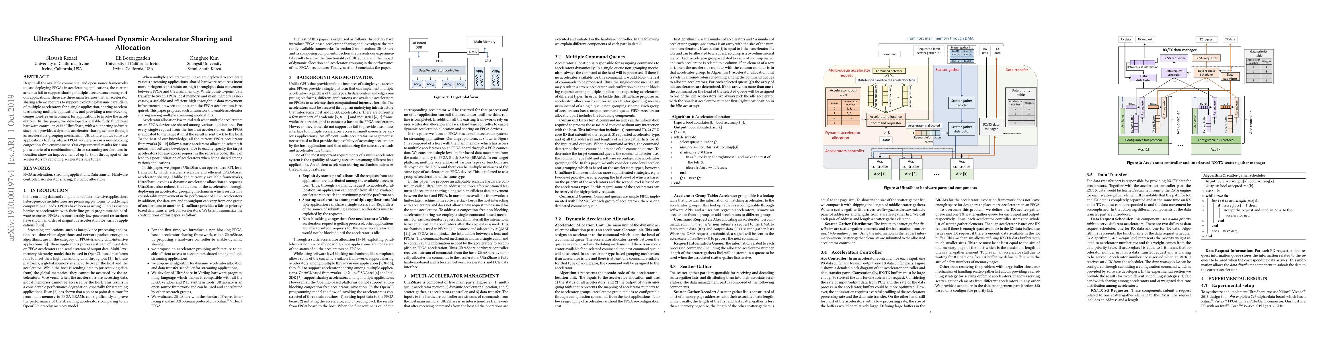 Despite all the available commercial and open-source frameworks to ease deploying FPGAs in accelerating applications, the current schemes fail to support sharing multiple accelerators among various applications. There are three main features that an accelerator sharing scheme requires to support: exploiting dynamic parallelism of multiple accelerators for a single application, sharing accelerators among multiple applications, and providing a non-blocking congestion-free environment for applications to invoke the accelerators. In this paper, we developed a scalable fully functional hardware controller, called UltraShare, with a supporting software stack that provides a dynamic accelerator sharing scheme through an accelerators grouping mechanism. UltraShare allows software applications to fully utilize FPGA accelerators in a non-blocking congestion-free environment. Our experimental results for a simple scenario of a combination of three streaming accelerators invocation show an improvement of up to 8x in throughput of the accelerators by removing accelerators idle times.