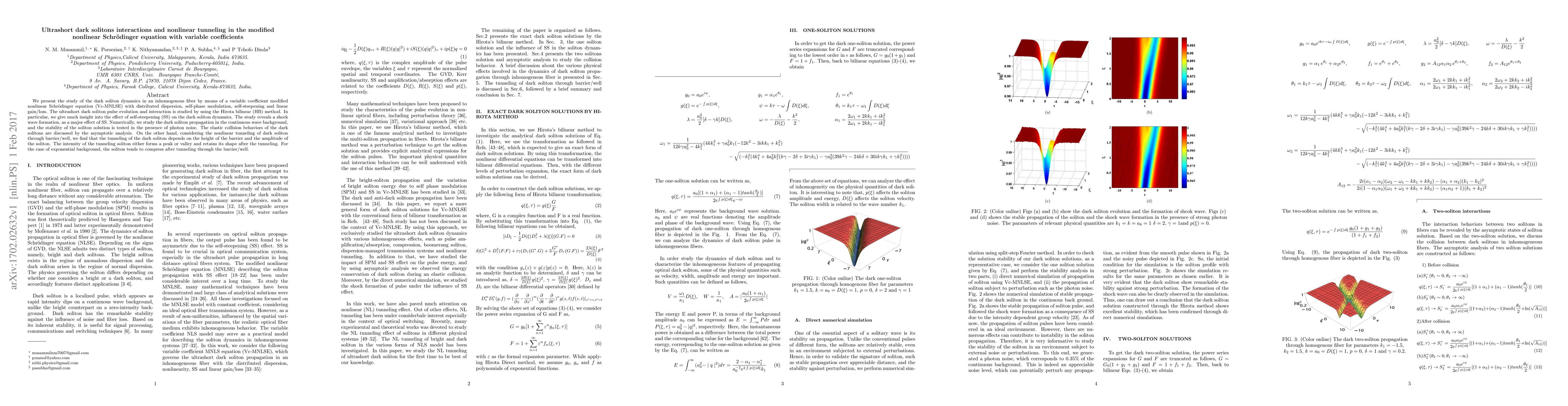 We present the study of the dark soliton dynamics in an inhomogenous fiber by means of a variable coefficient modified nonlinear Schr\"{o}dinger equation (Vc-MNLSE) with distributed dispersion, self-phase modulation, self-steepening and linear gain/loss. The ultrashort dark soliton pulse evolution and interaction is studied by using the Hirota bilinear (HB) method. In particular, we give much insight into the effect of self-steepening (SS) on the dark soliton dynamics. The study reveals a shock wave formation, as a major effect of SS. Numerically, we study the dark soliton propagation in the continuous wave background, and the stability of the soliton solution is tested in the presence of photon noise. The elastic collision behaviors of the dark solitons are discussed by the asymptotic analysis. On the other hand, considering the nonlinear tunneling of dark soliton through barrier/well, we find that the tunneling of the dark soliton depends on the height of the barrier and the amplitude of the soliton. The intensity of the tunneling soliton either forms a peak or valley and retains its shape after the tunneling. For the case of exponential background, the soliton tends to compress after tunneling through the barrier/well.