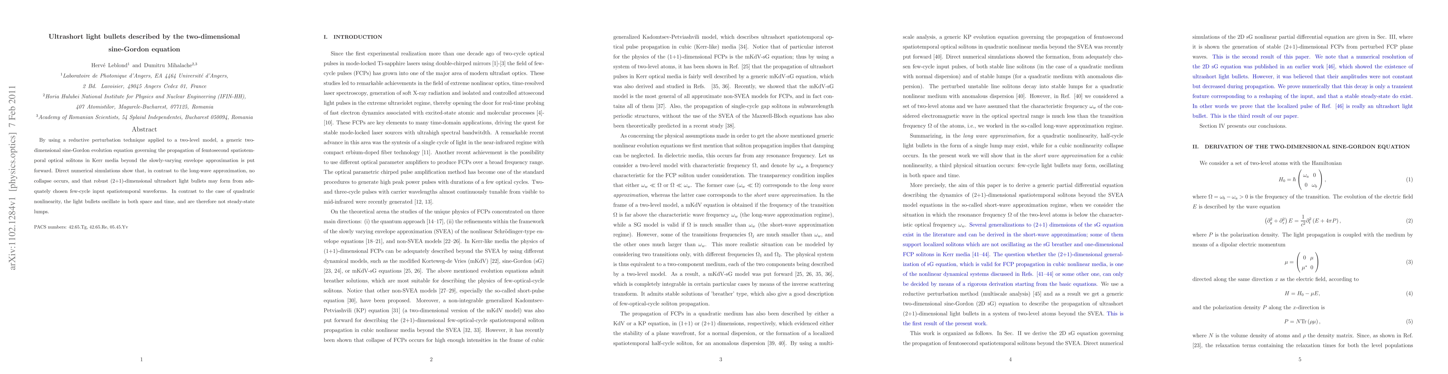 This study introduces a two-dimensional sine-Gordon equation to describe the propagation of femtosecond spatiotemporal optical solitons in Kerr media, revealing the formation of robust, oscillating (2+1)-dimensional ultrashort light bullets without collapse, unlike the long-wave approximation.