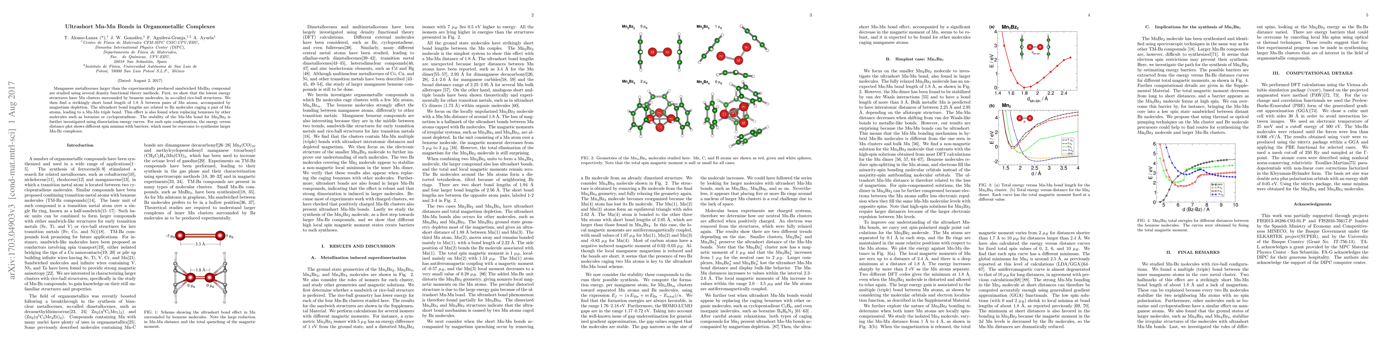 Manganese metallocenes larger than the experimentally produced sandwiched MnBz$_2$ compound are studied using several density functional theory methods. First, we show that the lowest energy structures have Mn clusters surrounded by benzene molecules, in so-called rice-ball structures. We then find a strikingly short bond length of 1.8 {\AA} between pairs of Mn atoms, accompanied by magnetism depletion. The ultrashort bond lengths are related to Bz molecules caging a pair of Mn atoms, leading to a Mn-Mn triple bond. This effect is also found when replacing benzenes by other molecules such as borazine or cyclopentadiene. The stability of the Mn-Mn bond for Mn$_2$Bz$_2$ is further investigated using dissociation energy curves. For each spin configuration, the energy versus distance plot shows different spin minima with barriers, which must be overcome to synthesize larger Mn-Bz complexes.