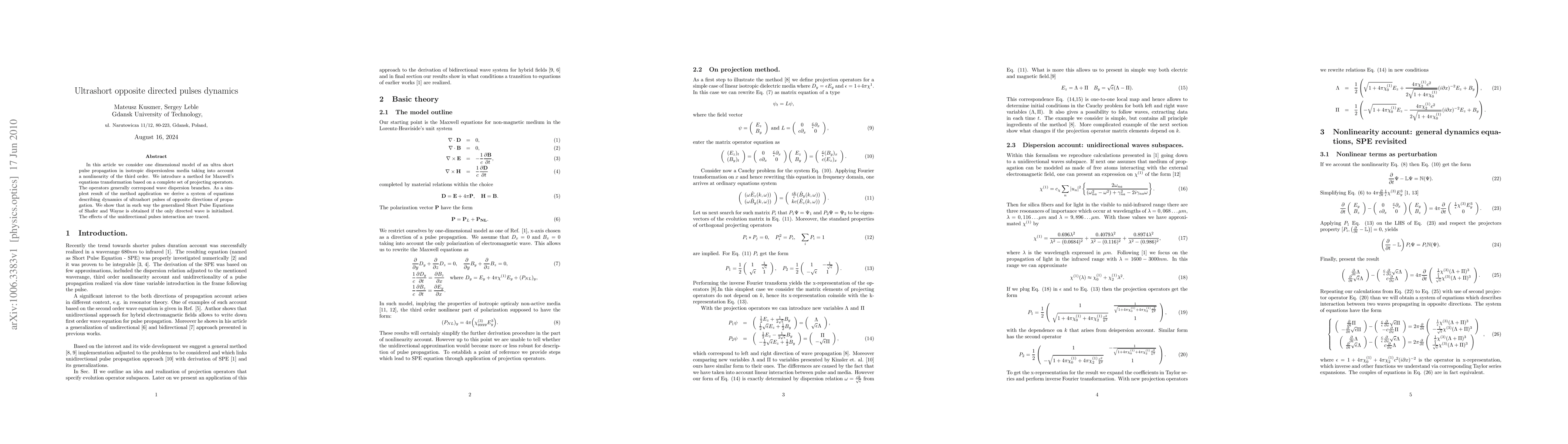 In this article we consider one dimensional model of an ultra short pulse propagation in isotropic dispersionless media taking into account a nonlinearity of the third order. We introduce a method for Maxwell's equations transformation based on a complete set of projecting operators. The operators generally correspond wave dispersion branches. As a simplest result of the method application we derive a system of equations describing dynamics of ultrashort pulses of opposite directions of propagation. We show that in such way the generalized Short Pulse Equations of Shafer and Wayne is obtained if the only directed wave is initialized. The effects of the unidirectional pulses interaction are traced.