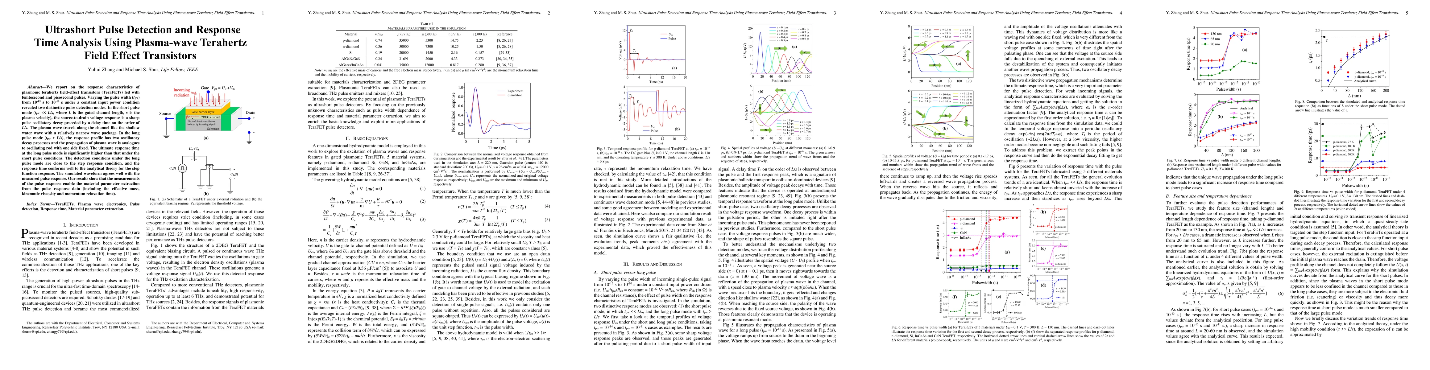 We report on the response characteristics of plasmonic terahertz field-effect transistors (TeraFETs) fed with femtosecond and picosecond pulses. Varying the pulse width (tpw) from 10-15 s to 10-10 s under a constant input power condition revealed two distinctive pulse detection modes. In the short pulse mode (tpw << L/s, where L is the gated channel length, s is the plasma velocity), the source-to-drain voltage response is a sharp pulse oscillatory decay preceded by a delay time on the order of L/s. The plasma wave travels along the channel like the shallow water wave with a relatively narrow wave package. In the long pulse mode (tpw > L/s), the response profile has two oscillatory decay processes and the propagation of plasma wave is analogues to oscillating rod with one side fixed. The ultimate response time at the long pulse mode is significantly higher than that under the short pulse conditions. The detection conditions under the long pulse mode are close to the step response condition, and the response time conforms well to the analytical theory for the step function response. The simulated waveform agrees well with the measured pulse response. Our results show that the measurements of the pulse response enable the material parameter extraction from the pulse response data (including the effective mass, kinematic viscosity and momentum relaxation time).
