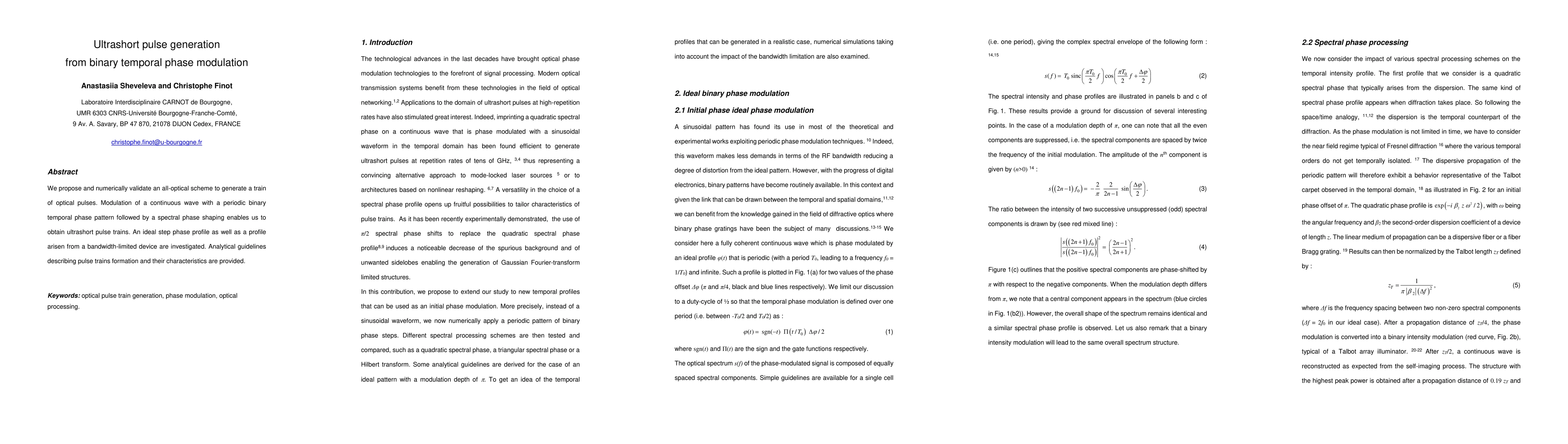 This paper proposes an all-optical method for generating ultrashort pulse trains by modulating a continuous wave with a binary temporal phase pattern and shaping the spectral phase. Analytical guidelines are provided to describe the formation and characteristics of the resulting pulse trains.