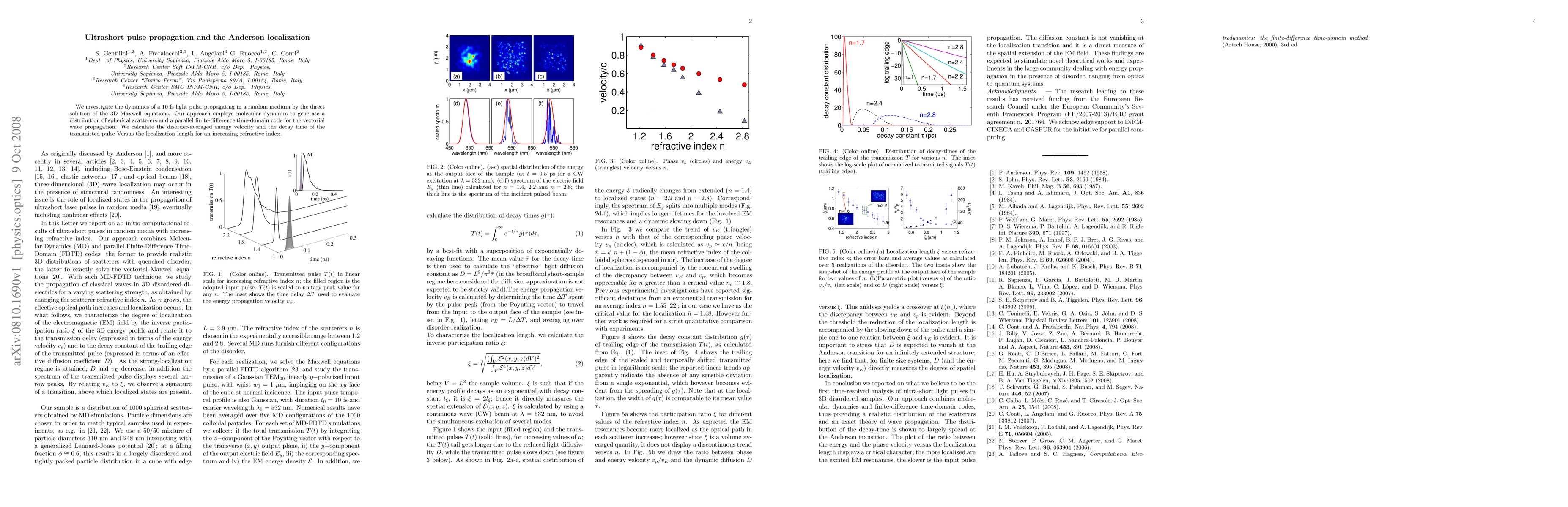 This study explores the propagation of ultrashort 10 fs light pulses in a random medium using molecular dynamics and parallel finite-difference time-domain methods. The research focuses on the disorder-averaged energy velocity and decay time of the transmitted pulse relative to the localization length as the refractive index increases.