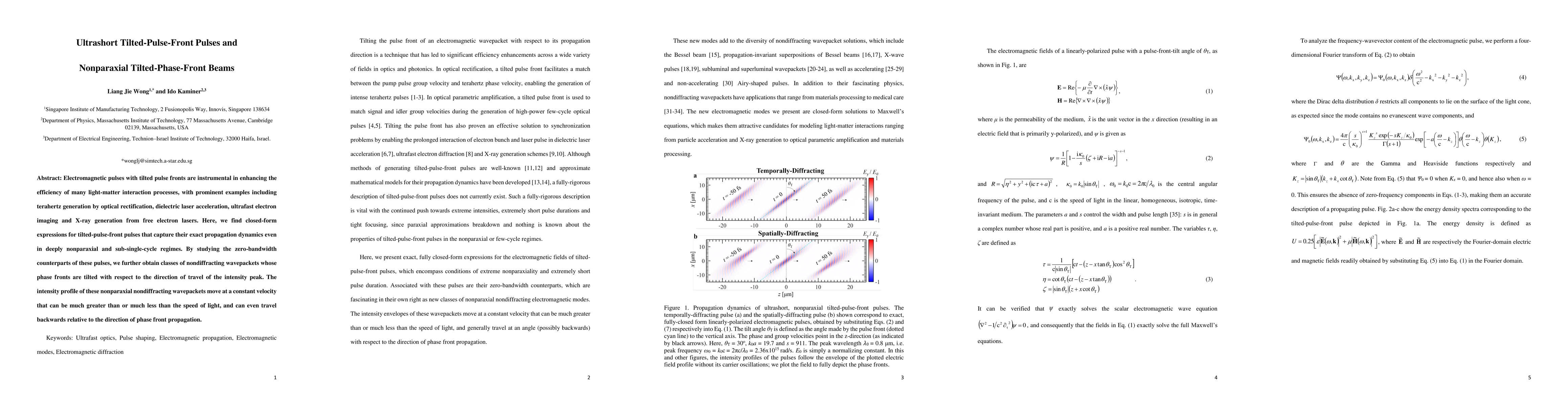 Electromagnetic pulses with tilted pulse fronts are instrumental in enhancing the efficiency of many light-matter interaction processes, with prominent examples including terahertz generation by optical rectification, dielectric laser acceleration, ultrafast electron imaging and X-ray generation from free electron lasers. Here, we find closed-form expressions for tilted-pulse-front pulses that capture their exact propagation dynamics even in deeply nonparaxial and sub-single-cycle regimes. By studying the zero-bandwidth counterparts of these pulses, we further obtain classes of nondiffracting wavepackets whose phase fronts are tilted with respect to the direction of travel of the intensity peak. The intensity profile of these nonparaxial nondiffracting wavepackets move at a constant velocity that can be much greater than or much less than the speed of light, and can even travel backwards relative to the direction of phase front propagation.