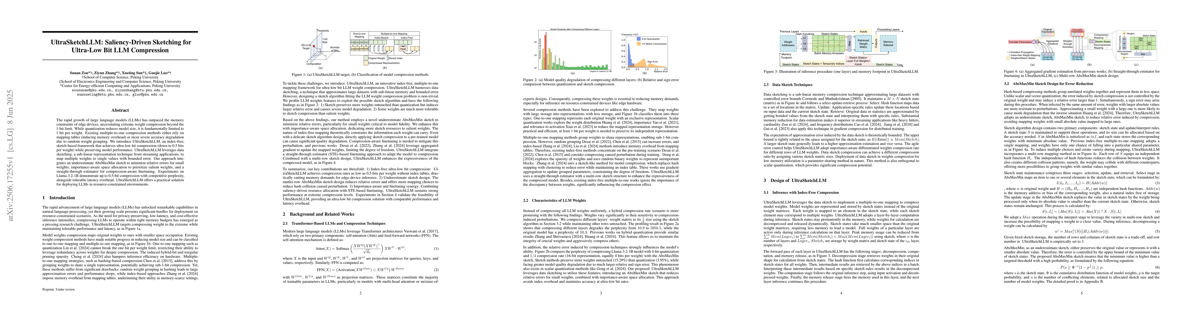 The paper introduces UltraSketchLLM, a novel framework that compresses large language models (LLMs) to ultra-low bitrates (0.5 bits per weight) without significant accuracy loss. It employs sketching techniques from data streaming to map multiple weights into one, prioritizing important weights and using a straight-through estimator for fine-tuning. Experiments show up to 0.5-bit compression on Llama-3.2-1B with maintained performance, making it suitable for edge devices.