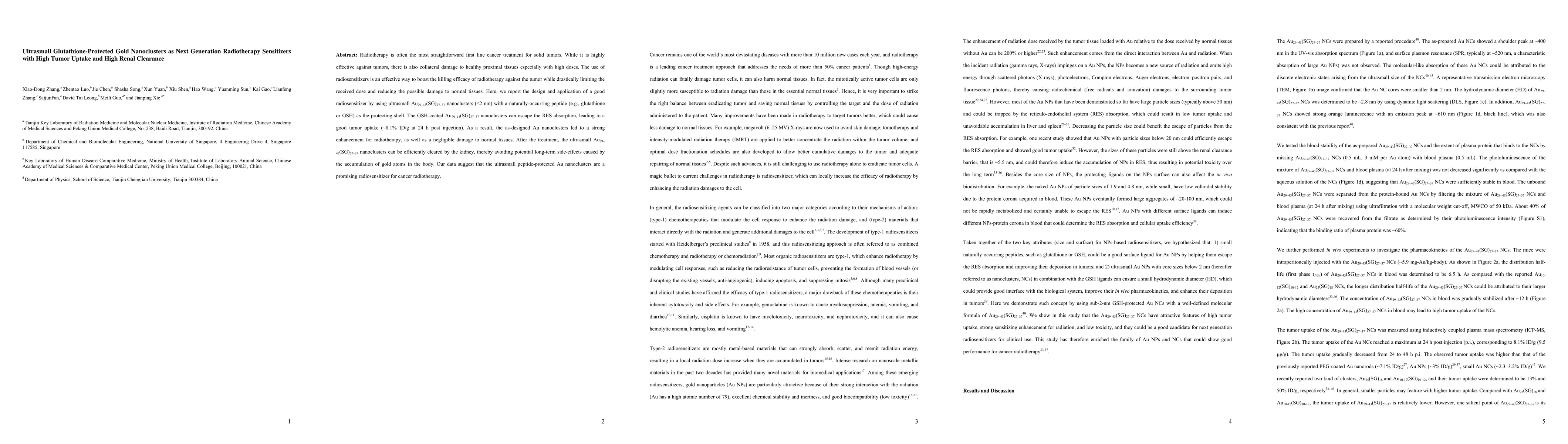 This paper reports the development of ultrasmall glutathione-protected gold nanoclusters as radiosensitizers for cancer radiotherapy, achieving high tumor uptake and efficient renal clearance, thereby enhancing radiotherapy efficacy while minimizing damage to normal tissues and reducing long-term side effects.