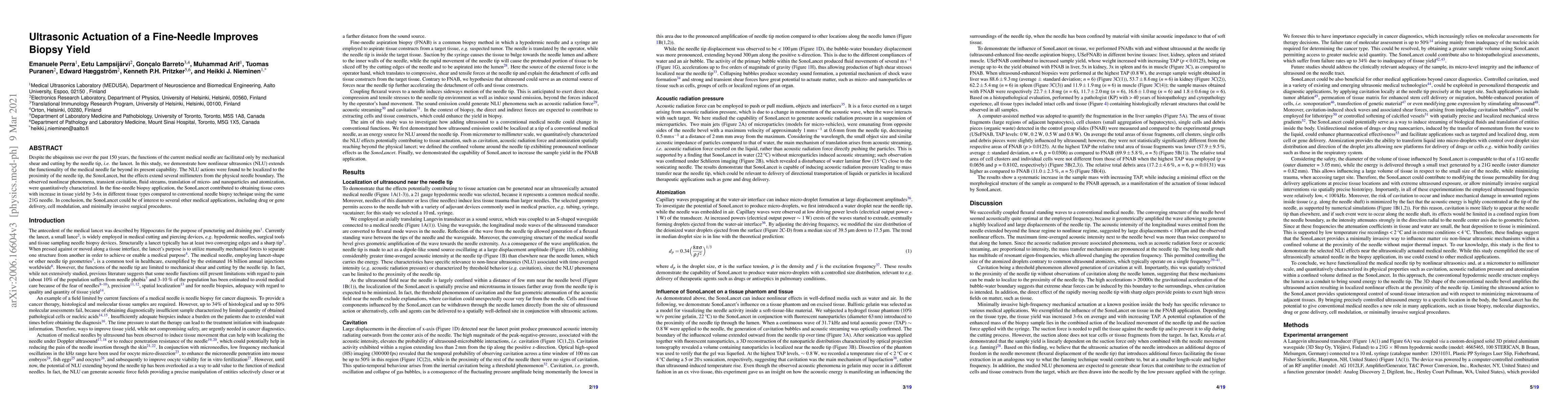 This study demonstrates that nonlinear ultrasonics (NLU) significantly enhance the functionality of fine-needle biopsy by increasing tissue yield by 3-6x compared to conventional methods. The NLU-enhanced SonoLancet induces localized nonlinear phenomena such as cavitation and fluid streams, extending beyond the needle tip.