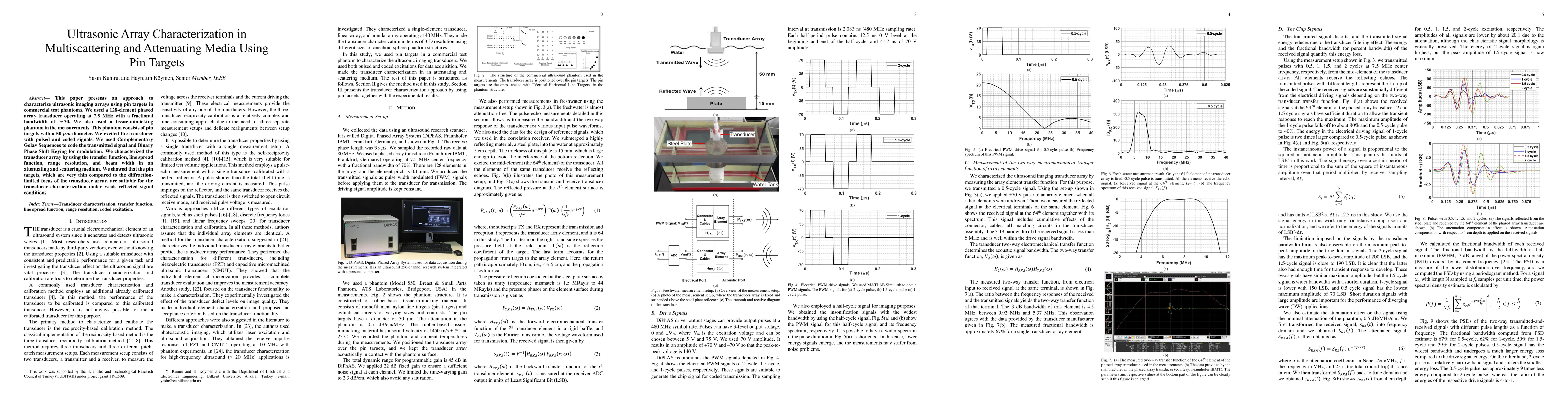 This paper characterizes a 128-element phased array transducer using pin targets in a tissue-mimicking phantom, employing Complementary Golay Sequences and Binary Phase Shift Keying for signal modulation, and evaluates its performance in terms of transfer function, line spread function, range resolution, and beam width. Pin targets prove effective in characterizing the array in weak reflected signal conditions.