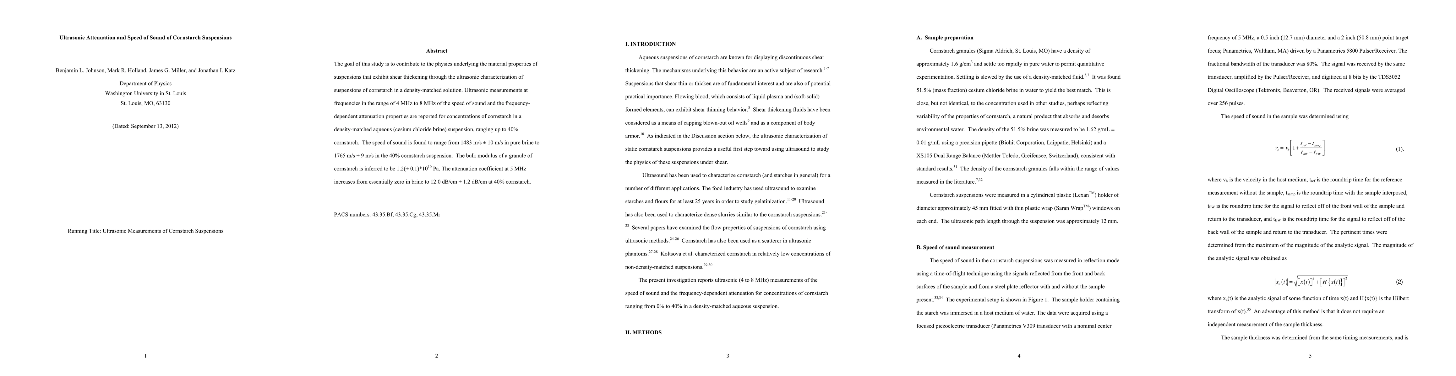 This study investigates the ultrasonic speed of sound and attenuation in cornstarch suspensions, finding that the speed increases with cornstarch concentration, while attenuation rises significantly, indicating complex material behavior in shear thickening.