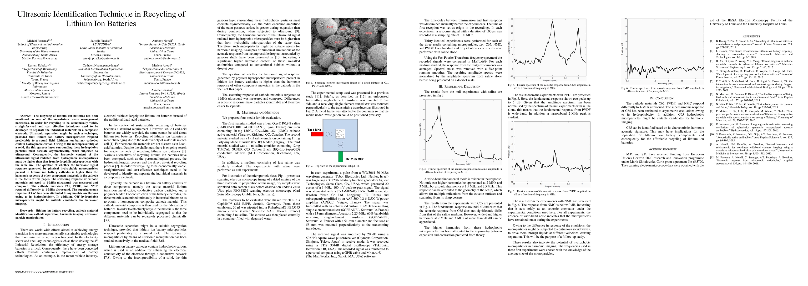 This paper investigates ultrasonic identification as a cost-effective recycling technique for lithium-ion batteries, focusing on the asymmetric oscillations of hydrophobic carbon particles in cathodes. The study finds that C65 cathode material exhibits a higher harmonic response under 1-MHz ultrasound due to its hydrophobic nature, suggesting potential for ultrasonic separation and imaging.