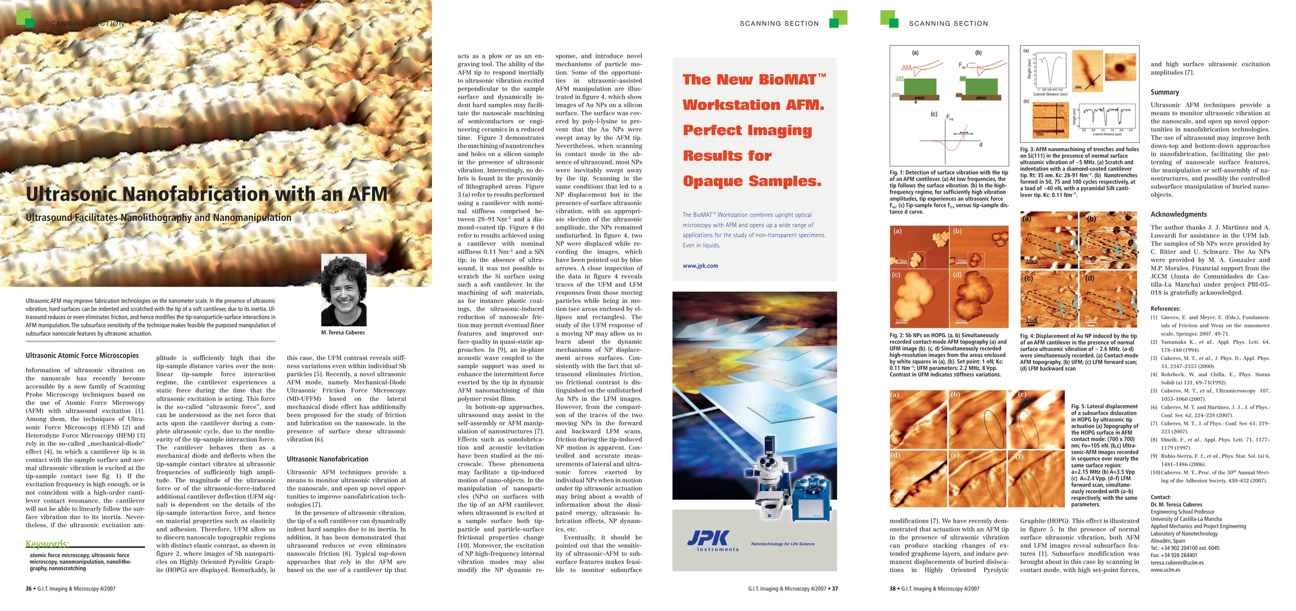 Ultrasonic AFM may improve fabrication technologies on the nanometer scale. In the presence of ultrasonic vibration, hard surfaces can be indented and scratched with the tip of a soft cantilever, due to its inertia. Ultrasound reduces or even eliminates friction, and hence modifies the tip-nanoparticle-surface interactions in AFM manipulation. The subsurface sensitivity of the technique makes feasible the purposed manipulation of subsurface nanoscale features by ultrasonic actuation.