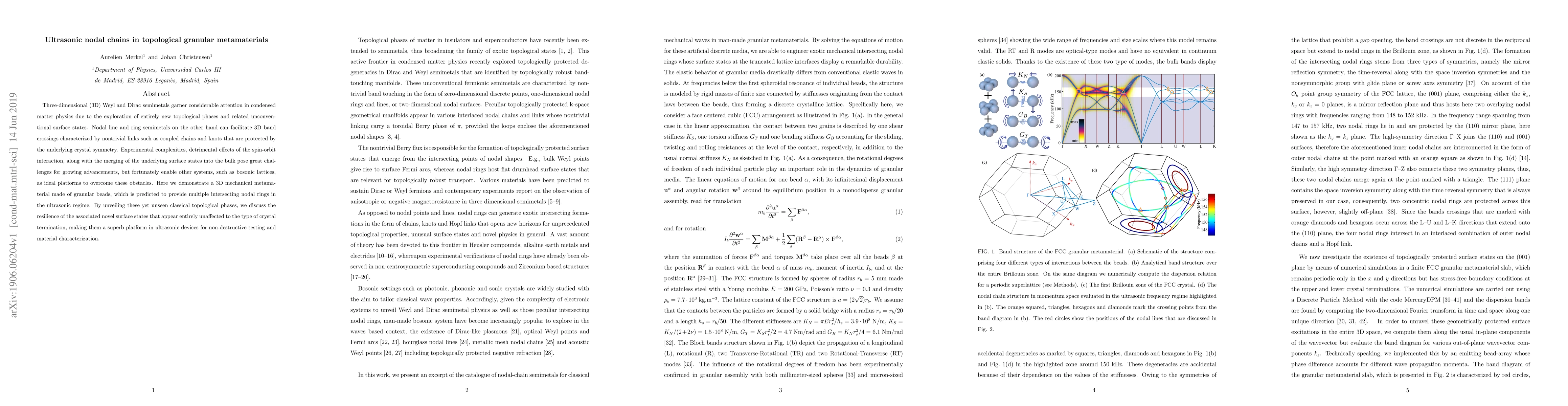 This paper explores 3D topological phases in granular metamaterials, demonstrating ultrasonic nodal chains and rings protected by crystal symmetry. These topological features enable robust surface states ideal for ultrasonic devices in non-destructive testing and material characterization.