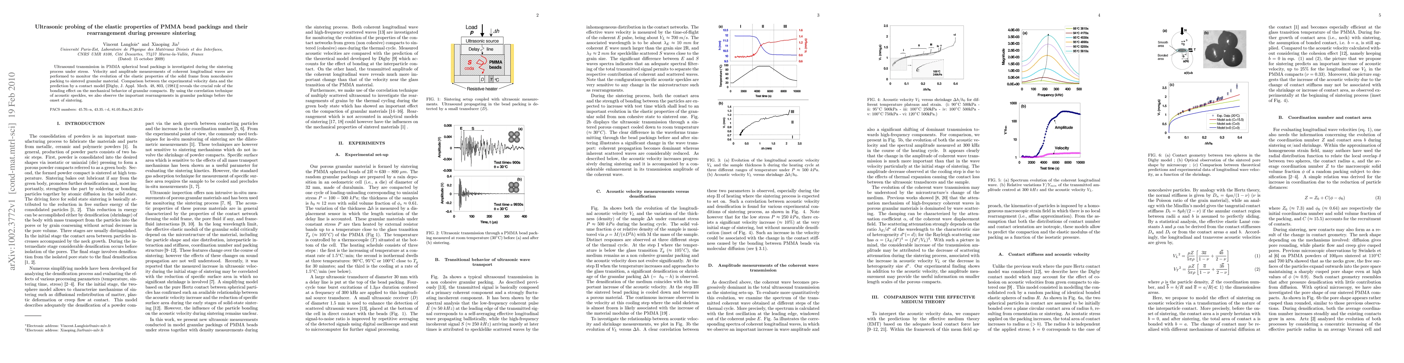 Ultrasound transmission in PMMA spherical bead packings is investigated during the sintering process under stress. Velocity and amplitude measurements of coherent longitudinal waves are performed to monitor the evolution of the elastic properties of the solid frame from noncohesive packing to sintered granular material. Comparison between the experimental velocity data and the prediction by a contact model [Digby, J. Appl. Mech. 48, 803, (1981)] reveals the crucial role of the bonding effect on the mechanical behavior of granular compacts. By using the correlation technique of acoustic speckles, we also observe the important rearrangements in granular packings before the onset of sintering.