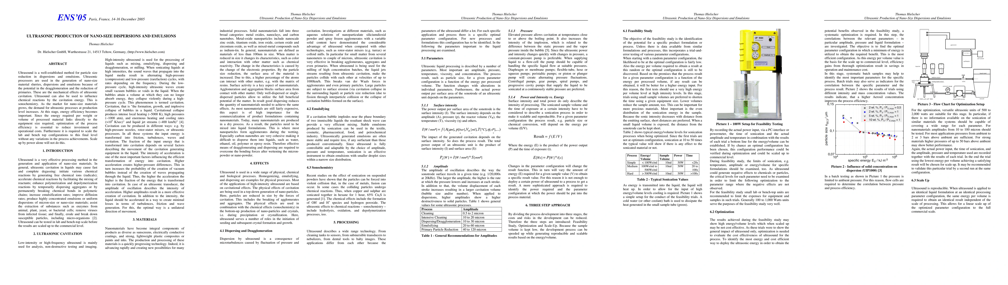 This paper explores the use of ultrasonic processors for creating nano-size dispersions and emulsions, emphasizing the importance of ultrasonic cavitation for deagglomeration and size reduction. It highlights the need for energy efficiency and process optimization to reduce costs and scale lab-based methods to industrial production without compromising quality.