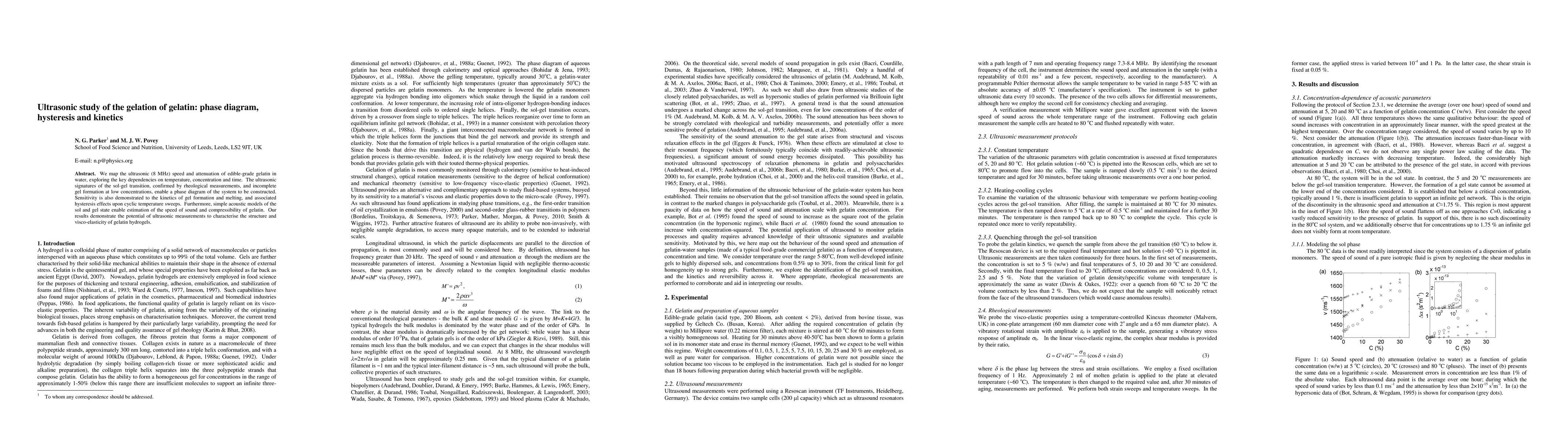 We map the ultrasonic (8 MHz) speed and attenuation of edible-grade gelatin in water, exploring the key dependencies on temperature, concentration and time. The ultrasonic signatures of the sol-gel transition, confirmed by rheological measurements, and incomplete gel formation at low concentrations, enable a phase diagram of the system to be constructed. Sensitivity is also demonstrated to the kinetics of gel formation and melting, and associated hysteresis effects upon cyclic temperature sweeps. Furthermore, simple acoustic models of the sol and gel state enable estimation of the speed of sound and compressibility of gelatin. Our results demonstrate the potential of ultrasonic measurements to characterise the structure and visco-elasticity of gelatin hydrogels.