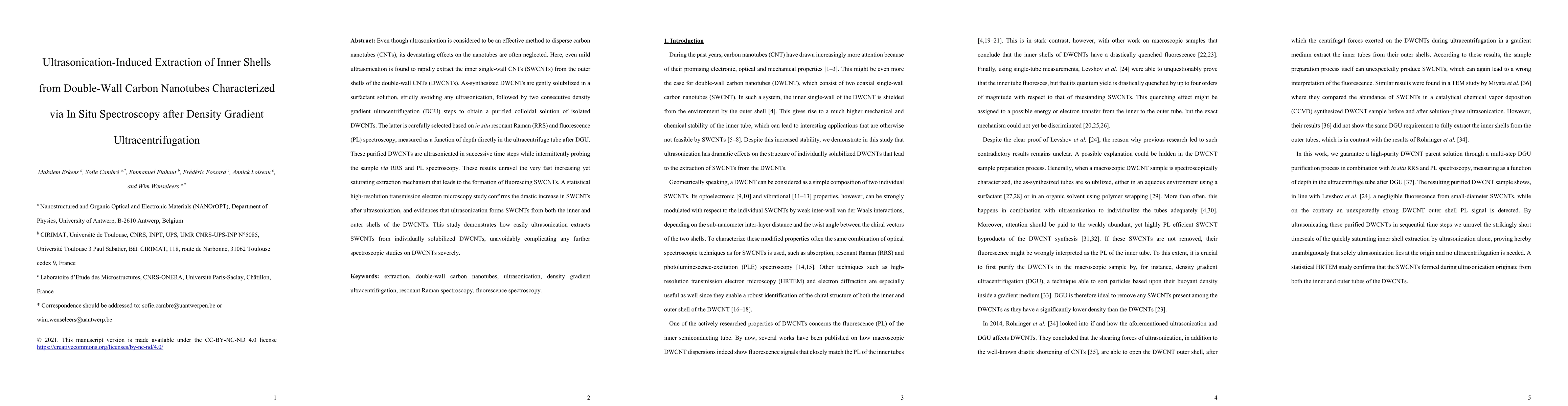 Even though ultrasonication is considered to be an effective method to disperse carbon nanotubes (CNTs), its devastating effects on the nanotubes are often neglected. Here, even mild ultrasonication is found to rapidly extract the inner single-wall CNTs (SWCNTs) from the outer shells of the double-wall CNTs (DWCNTs). As-synthesized DWCNTs are gently solubilized in a surfactant solution, strictly avoiding any ultrasonication, followed by two consecutive density gradient ultracentrifugation (DGU) steps to obtain a purified colloidal solution of isolated DWCNTs. The latter is carefully selected based on in situ resonant Raman (RRS) and fluorescence (PL) spectroscopy, measured as a function of depth directly in the ultracentrifuge tube after DGU. These purified DWCNTs are ultrasonicated in successive time steps while intermittently probing the sample via RRS and PL spectroscopy. These results unravel the very fast increasing yet saturating extraction mechanism that leads to the formation of fluorescing SWCNTs. A statistical high-resolution transmission electron microscopy study confirms the drastic increase in SWCNTs after ultrasonication, and evidences that ultrasonication forms SWCNTs from both the inner and outer shells of the DWCNTs. This study demonstrates how easily ultrasonication extracts SWCNTs from individually solubilized DWCNTs, unavoidably complicating any further spectroscopic studies on DWCNTs severely.