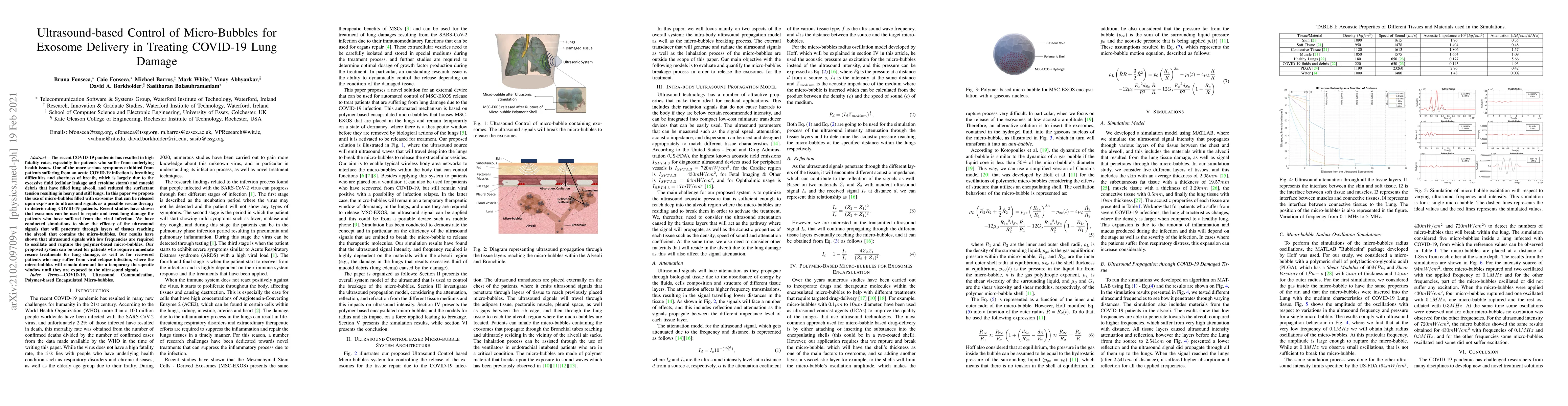 This paper proposes using ultrasound-controlled micro-bubbles filled with exosomes to treat COVID-19-induced lung damage. Simulations demonstrate that low-frequency ultrasound can rupture the micro-bubbles to release exosomes, which have shown potential in repairing lung tissue.
