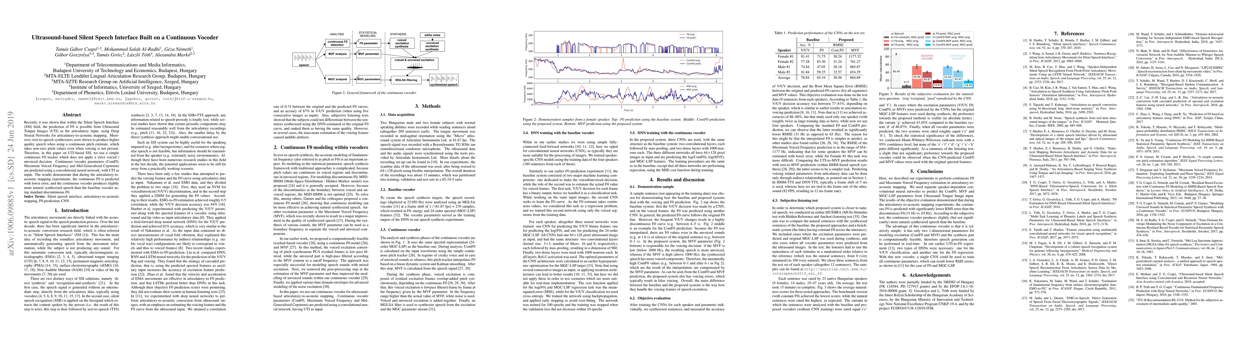 This paper develops an Ultrasound-based Silent Speech Interface (SSI) using continuous vocoder parameters predicted from Ultrasound Tongue Images (UTI) via a convolutional neural network. The continuous F0 tracker produces more natural synthesized speech compared to traditional discontinuous F0 methods.
