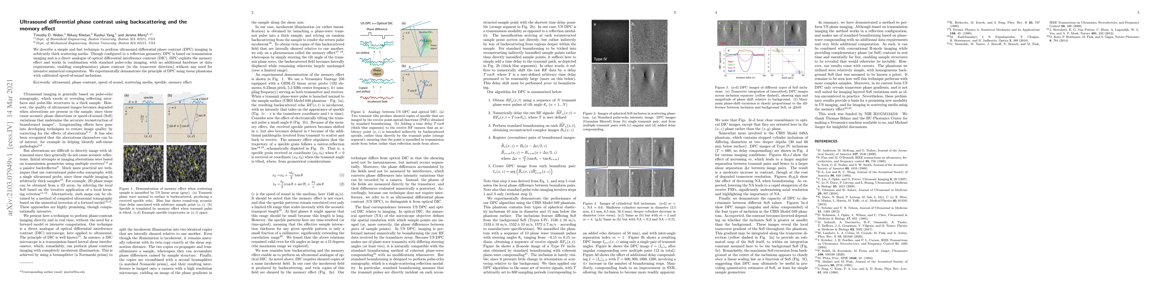 We describe a simple and fast technique to perform ultrasound differential phase contrast (DPC) imaging in arbitrarily thick scattering media. Though configured in a reflection geometry, DPC is based on transmission imaging and is a direct analogue of optical differential interference contrast (DIC). DPC exploits the memory effect and works in combination with standard pulse-echo imaging, with no additional hardware or data requirements, enabling complementary phase contrast (in the transverse direction) without any need for intensive numerical computation. We experimentally demonstrate the principle of DPC using tissue phantoms with calibrated speed-of-sound inclusions.