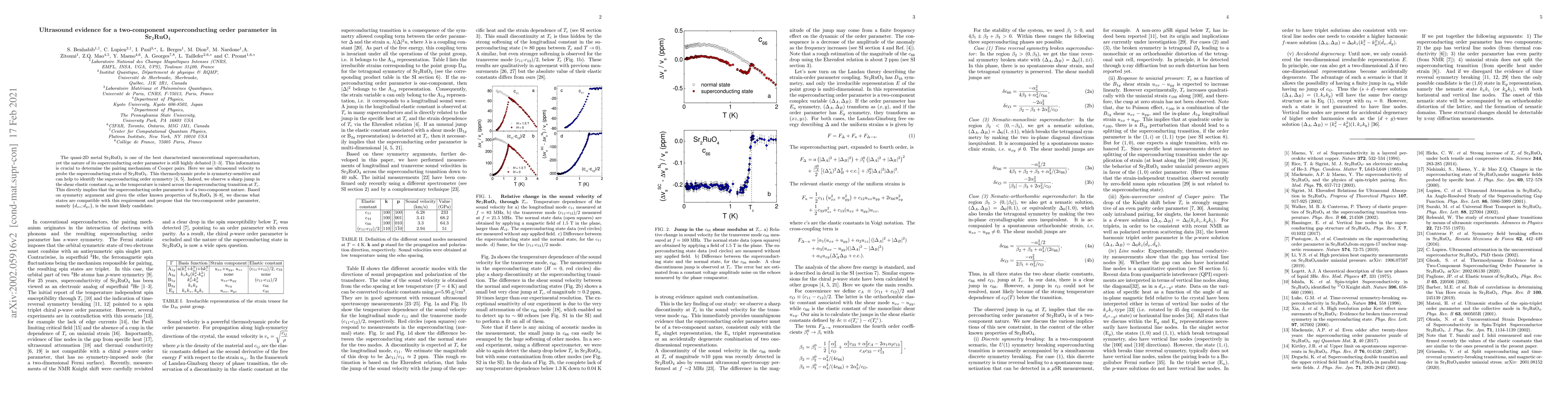 This research uses ultrasound to reveal a sharp change in Sr$_2$RuO$_4$'s shear elastic constant across its superconducting transition, suggesting a two-component superconducting order parameter. The findings support the possibility of a pairing mechanism involving $d_{xz}$ and $d_{yz}$ orbital components.