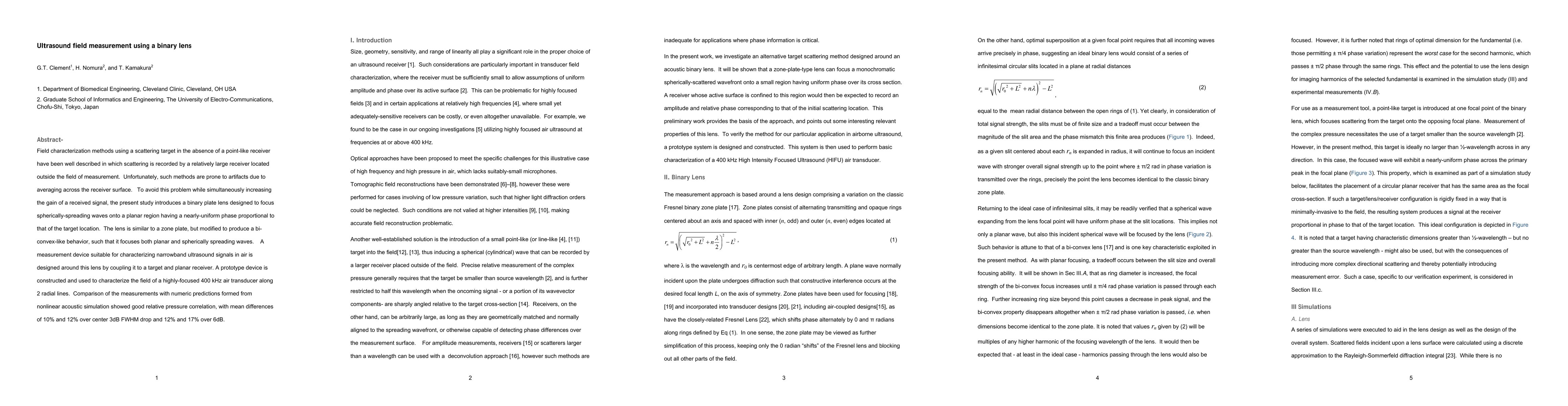 A new binary lens is introduced to focus ultrasound waves onto a planar region for field measurement, reducing averaging artifacts and increasing signal gain.