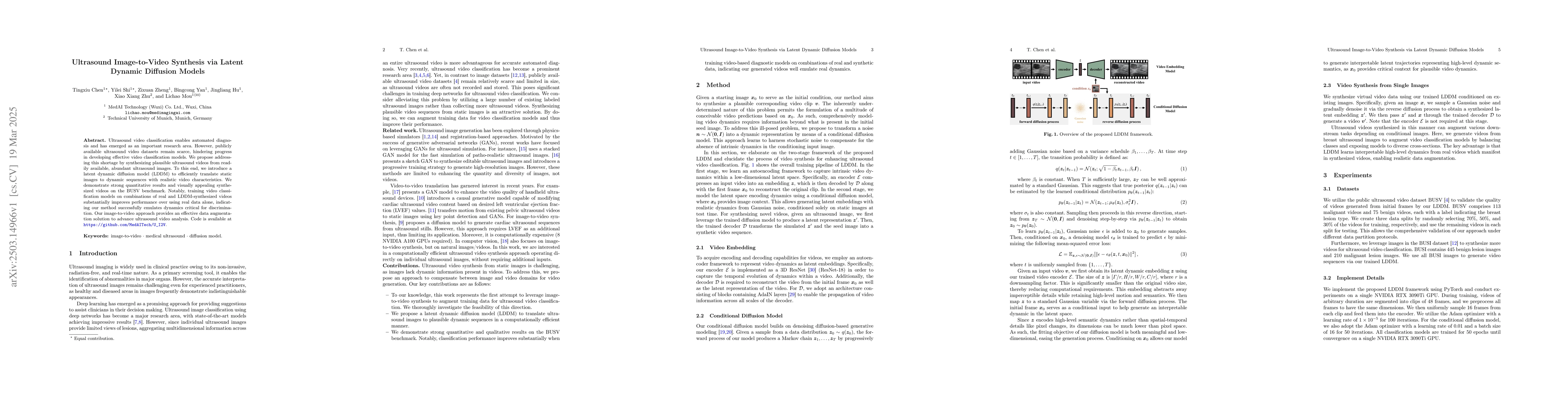 The paper proposes a novel latent dynamic diffusion model (LDDM) for synthesizing ultrasound videos from static images, leveraging a diffusion model-based approach to generate realistic video sequences with high-level dynamics.
