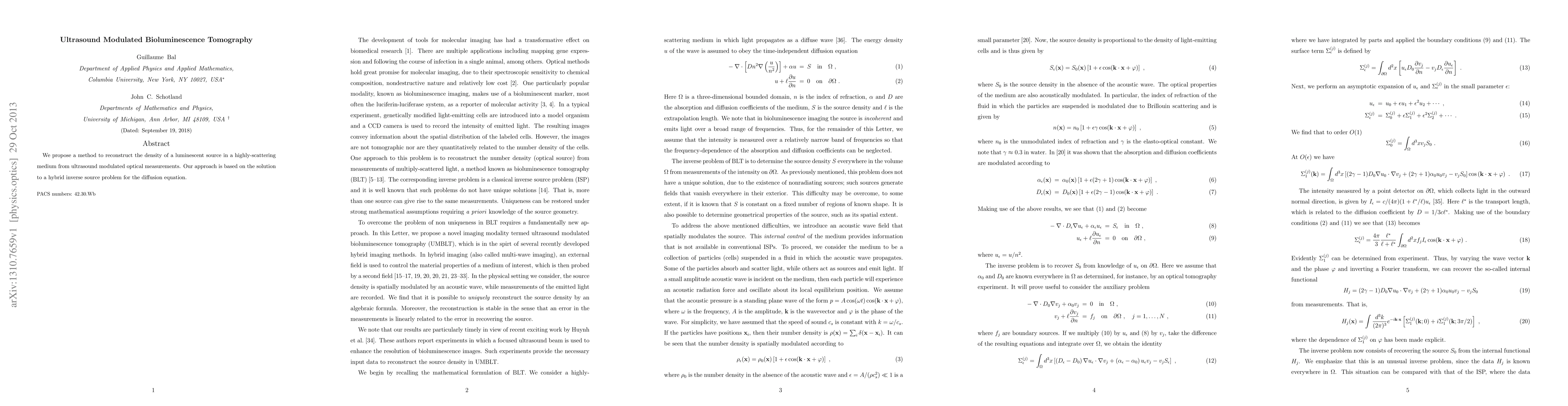 Summary: This paper introduces a novel method to reconstruct the density of luminescent sources within a highly scattering medium using ultrasound-modulated optical measurements, leveraging a solution to a hybrid inverse source problem for the diffusion equation.