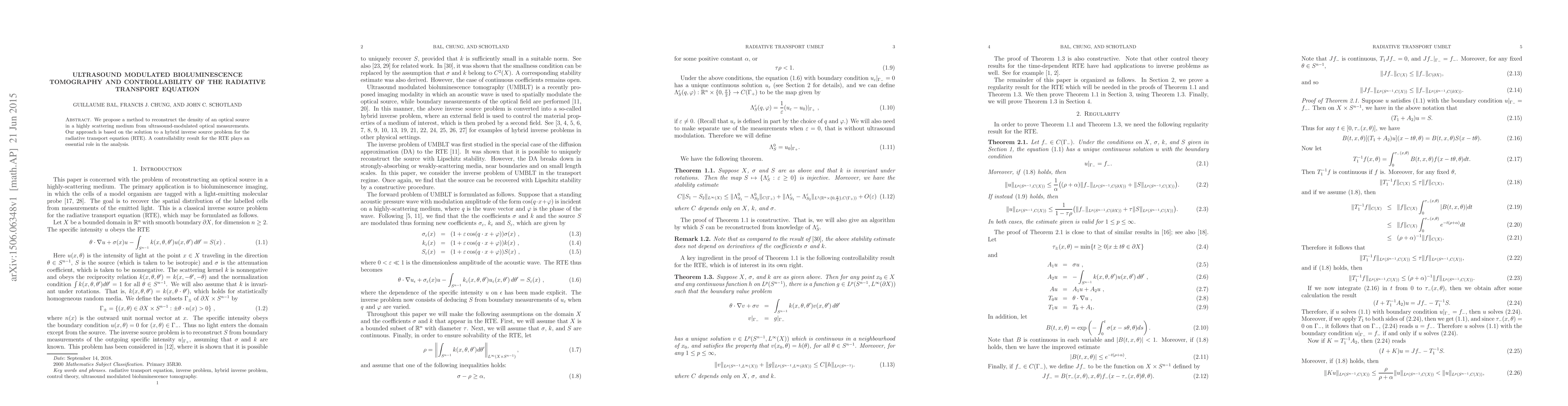 We propose a method to reconstruct the density of an optical source in a highly scattering medium from ultrasound-modulated optical measurements. Our approach is based on the solution to a hybrid inverse source problem for the radiative transport equation (RTE). A controllability result for the RTE plays an essential role in the analysis.