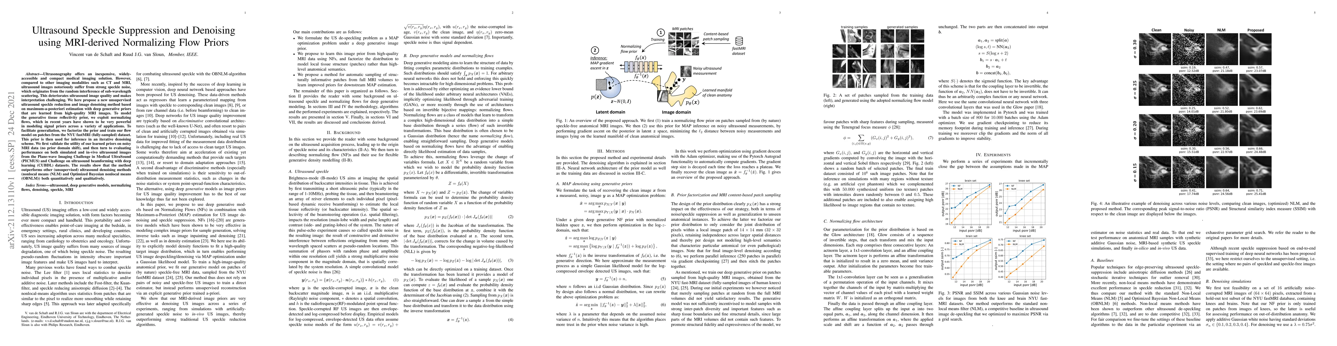 This research introduces a novel unsupervised method for reducing speckle noise and denoising ultrasound images using MRI-derived normalizing flow priors. The method outperforms existing techniques on both simulated and real ultrasound images, enhancing image quality and interpretation.