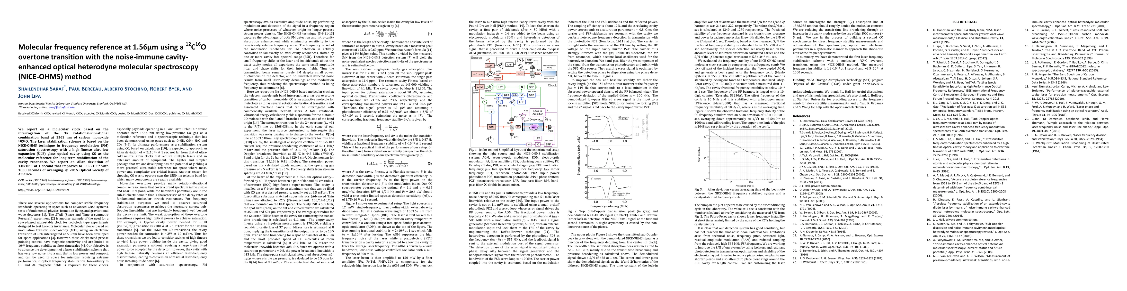 This paper presents an ultrastable frequency reference at 1.56 μm based on a CO molecular overtone transition, employing NICEOHMS for high signal-to-noise ratio. The method achieves an Allan Deviation of 1.8x10^-12 at 1 second, improving to 3.5x10^-14 after 1000 seconds.