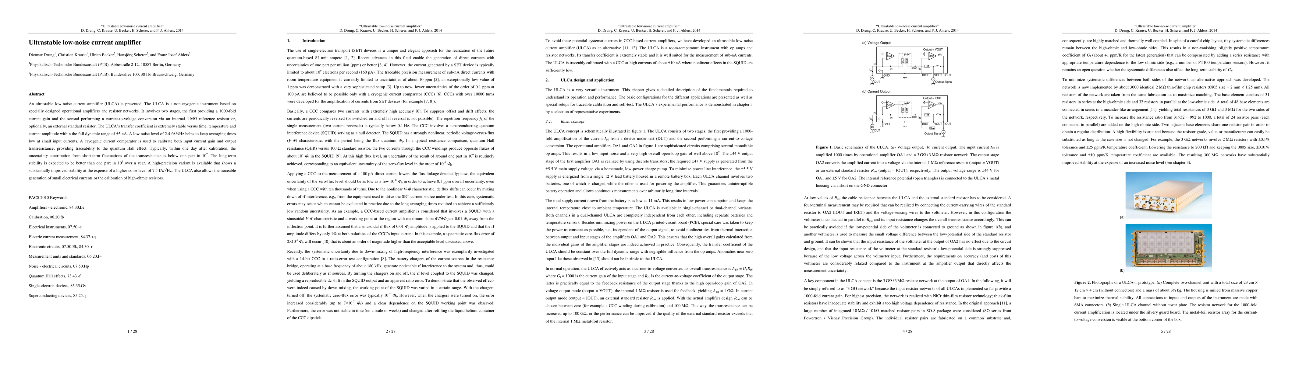 The paper introduces an ultrastable low-noise current amplifier (ULCA) with a 1000-fold gain and low noise level of 2.4 fA/sqrt(Hz), featuring exceptional stability and traceability to the quantum Hall effect. The ULCA's high precision variant offers improved stability at the cost of a higher noise level.