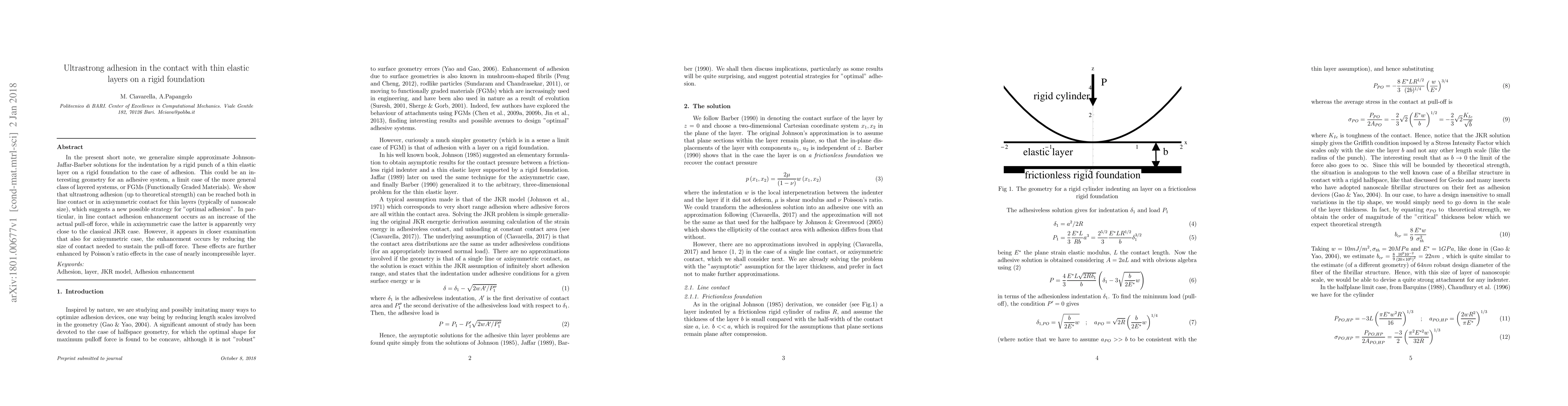 In the present short note, we generalize simple approximate Johnson-Jaffar-Barber solutions for the indentation by a rigid punch of a thin elastic layer on a rigid foundation to the case of adhesion. This could be an interesting geometry for an adhesive system, a limit case of the more general class of layered systems, or FGMs (Functionally Graded Materials). We show that ultrastrong adhesion (up to theoretical strength) can be reached both in line contact or in axisymmetric contact for thin layers (typically of nanoscale size), which suggests a new possible strategy for "optimal adhesion". In particular, in line contact adhesion enhancement occurs as an increase of the actual pull-off force, while in axisymmetric case the latter is apparently very close to the classical JKR case. However, it appears in closer examination that also for axisymmetric case, the enhancement occurs by reducing the size of contact needed to sustain the pull-off force. These effects are further enhanced by Poisson's ratio effects in the case of nearly incompressible layer.