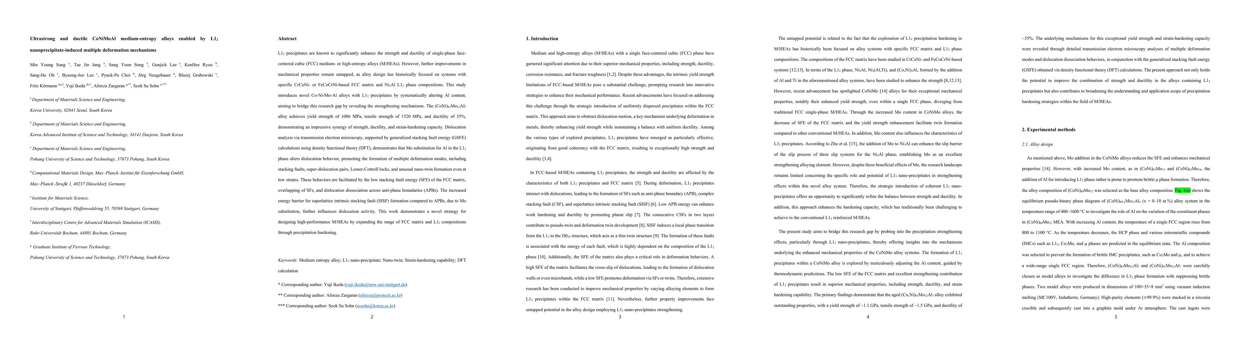 This research introduces novel CoNiMoAl medium-entropy alloys with enhanced strength and ductility due to L12 nanoprecipitates. By adjusting Al content, the alloy (CoNi)81Mo12Al7 achieves high yield and tensile strengths along with notable ductility, demonstrating multiple deformation mechanisms facilitated by Mo substitution and low stacking fault energy in the FCC matrix.