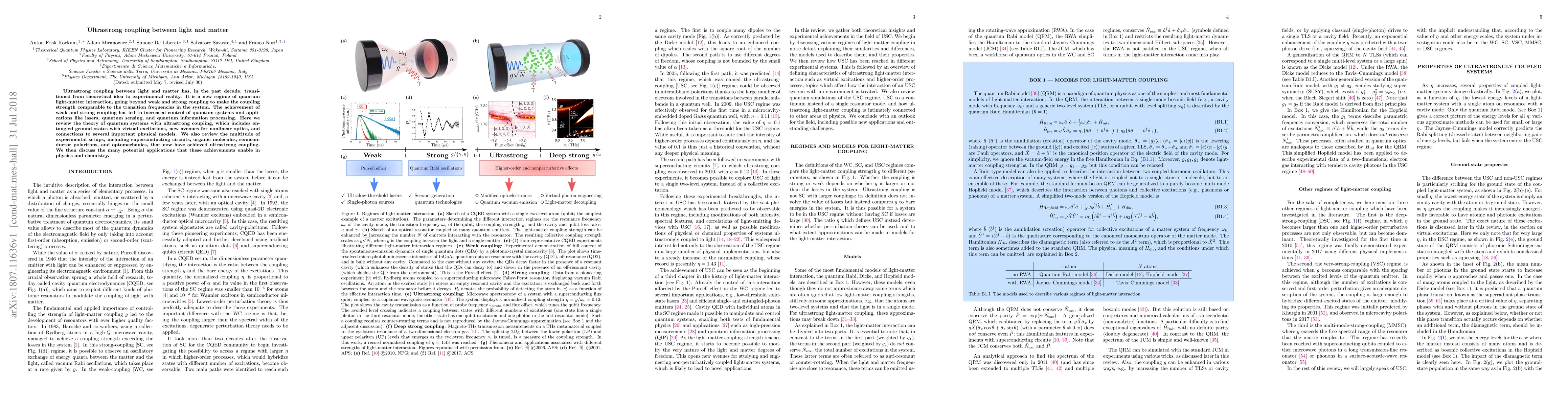 This paper reviews ultrastrong coupling between light and matter, a new quantum regime surpassing weak and strong coupling. It explores theoretical frameworks, experimental realizations using various systems, and potential applications in quantum technologies.