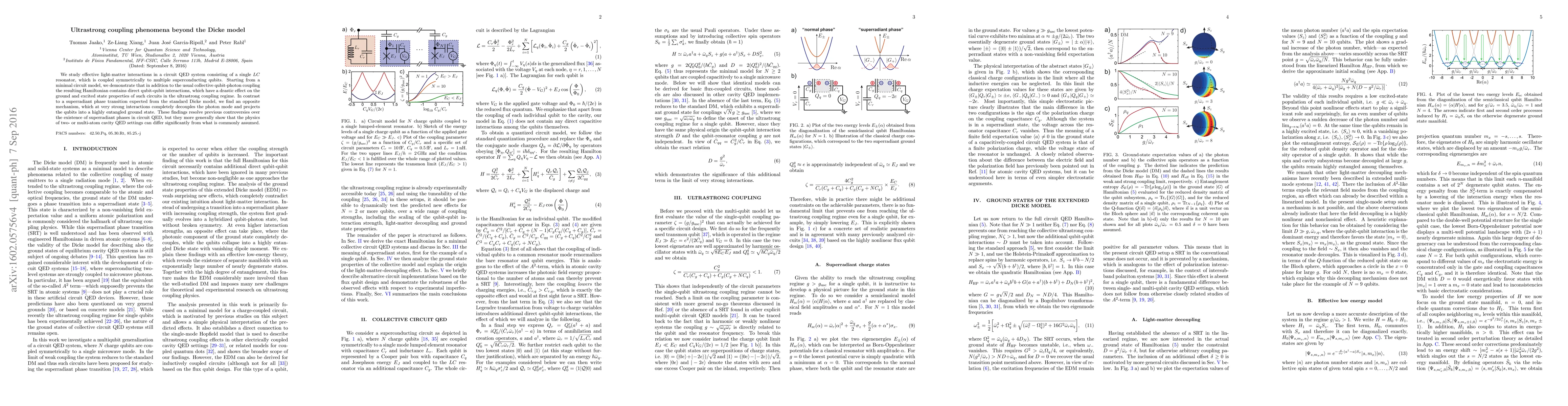 This paper investigates light-matter interactions in a circuit QED system with multiple superconducting qubits coupled to a single LC resonator, revealing direct qubit-qubit interactions in the ultrastrong coupling regime. Contrary to the Dicke model's superradiant phase, it finds a decoupling mechanism that projects qubits into a highly entangled ground state.