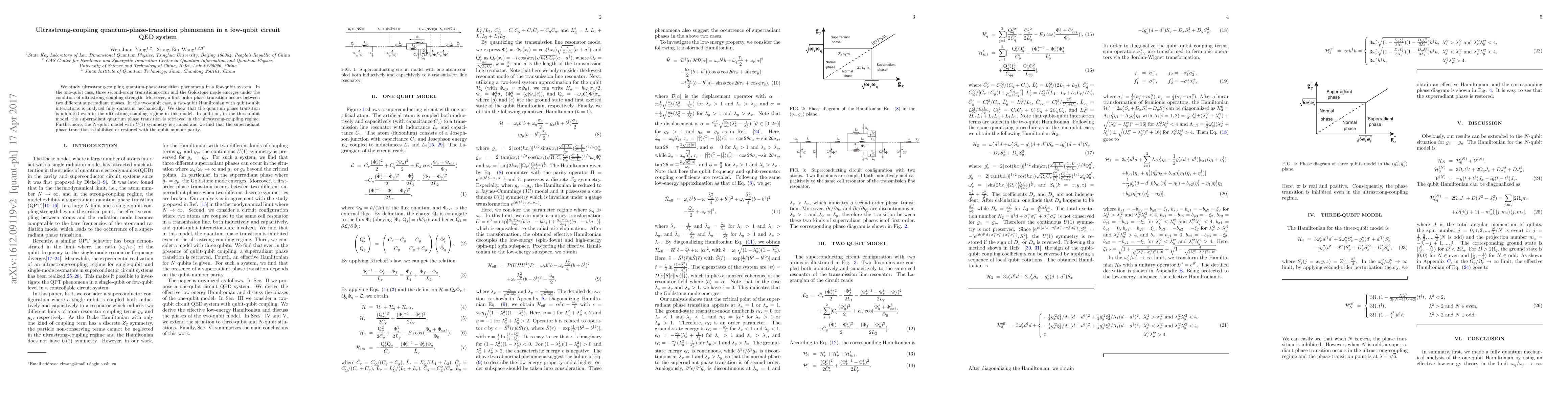 This paper investigates ultrastrong-coupling quantum phase transitions in few-qubit circuit QED systems, revealing that while one-qubit systems exhibit multiple transitions and a Goldstone mode, two-qubit systems inhibit such transitions, whereas three-qubit systems restore them, with the N-qubit model's behavior dependent on qubit-number parity.