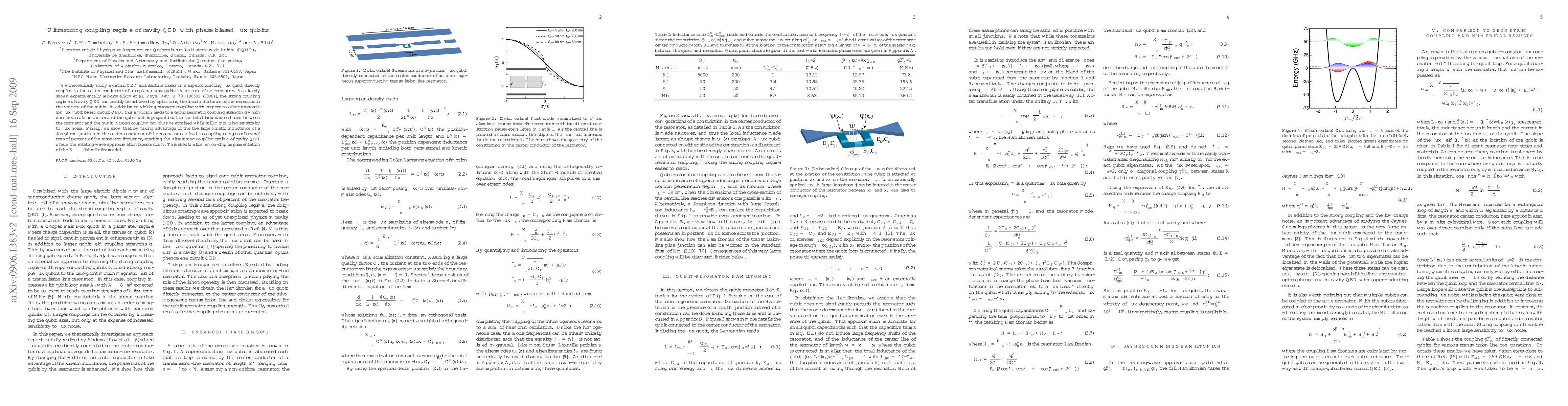This paper explores a circuit QED architecture using superconducting flux qubits coupled to a coplanar waveguide resonator, achieving ultrastrong coupling by optimizing the resonator's inductance and minimizing flux noise sensitivity. The approach allows reaching the ultrastrong coupling regime, enabling the implementation of the E x B Jahn-Teller model.
