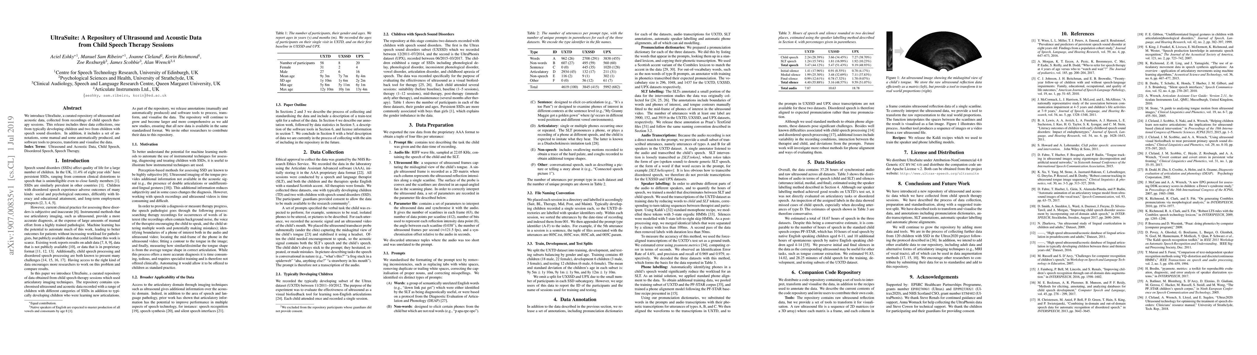 UltraSuite is a repository of ultrasound and acoustic data from child speech therapy sessions, featuring three collections from typically developing children and those with speech sound disorders, along with annotations and tools for data processing and visualization.