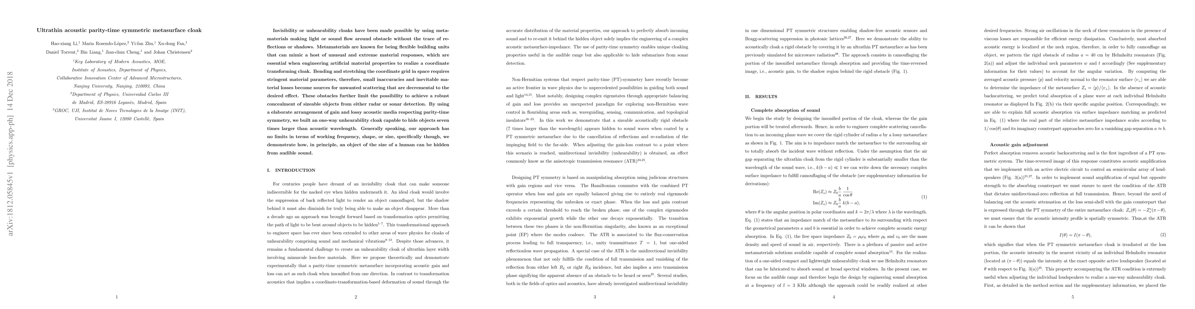 This paper presents an ultrathin acoustic cloak utilizing parity-time symmetric metasurfaces to achieve unhearability for objects seven times larger than the acoustic wavelength, overcoming limitations of traditional metamaterials by mitigating scattering and material losses. The proposed method is flexible and applicable across various frequencies, shapes, and sizes, demonstrating potential for hiding objects the size of a human from audible sound.