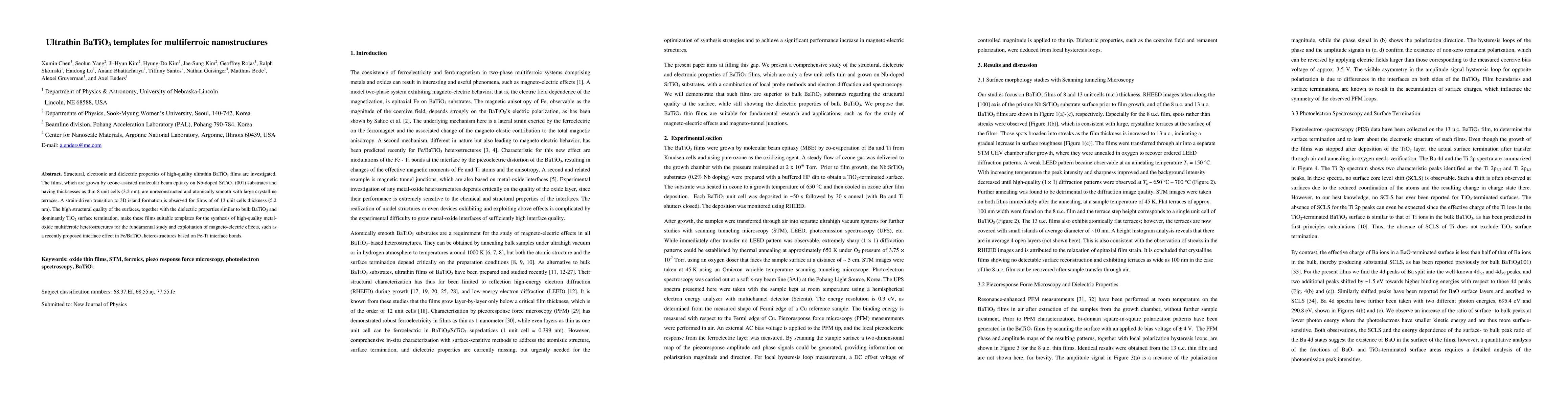 This paper investigates ultrathin BaTiO3 films grown by ozone-assisted molecular beam epitaxy, revealing high structural quality and dielectric properties similar to bulk material, making them ideal templates for multiferroic nanostructures and the study of magneto-electric effects. Strain-driven transition to 3D island formation occurs at 13 unit cells thickness.