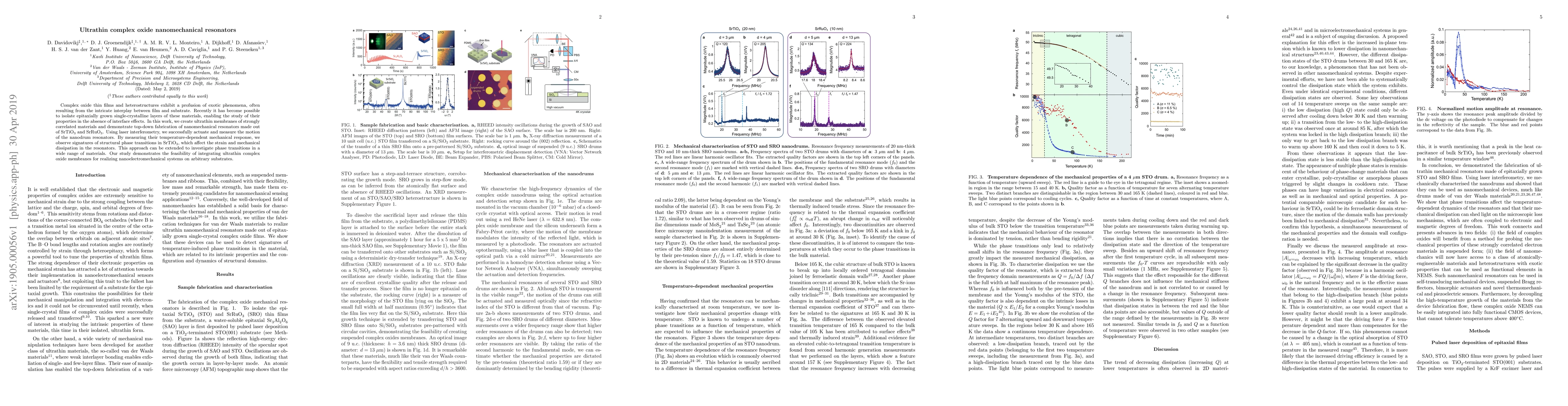 Complex oxide thin films and heterostructures exhibit a profusion of exotic phenomena, often resulting from the intricate interplay between film and substrate. Recently it has become possible to isolate epitaxially grown single-crystalline layers of these materials, enabling the study of their properties in the absence of interface effects. In this work, we create ultrathin membranes of strongly correlated materials and demonstrate top-down fabrication of nanomechanical resonators made out of \ce{SrTiO3} and \ce{SrRuO3}. Using laser interferometry, we successfully actuate and measure the motion of the nanodrum resonators. By measuring their temperature-dependent mechanical response, we observe signatures of structural phase transitions in \ce{SrTiO3}, which affect the strain and mechanical dissipation in the resonators. This approach can be extended to investigate phase transitions in a wide range of materials. Our study demonstrates the feasibility of integrating ultrathin complex oxide membranes for realizing nanoelectromechanical systems on arbitrary substrates.